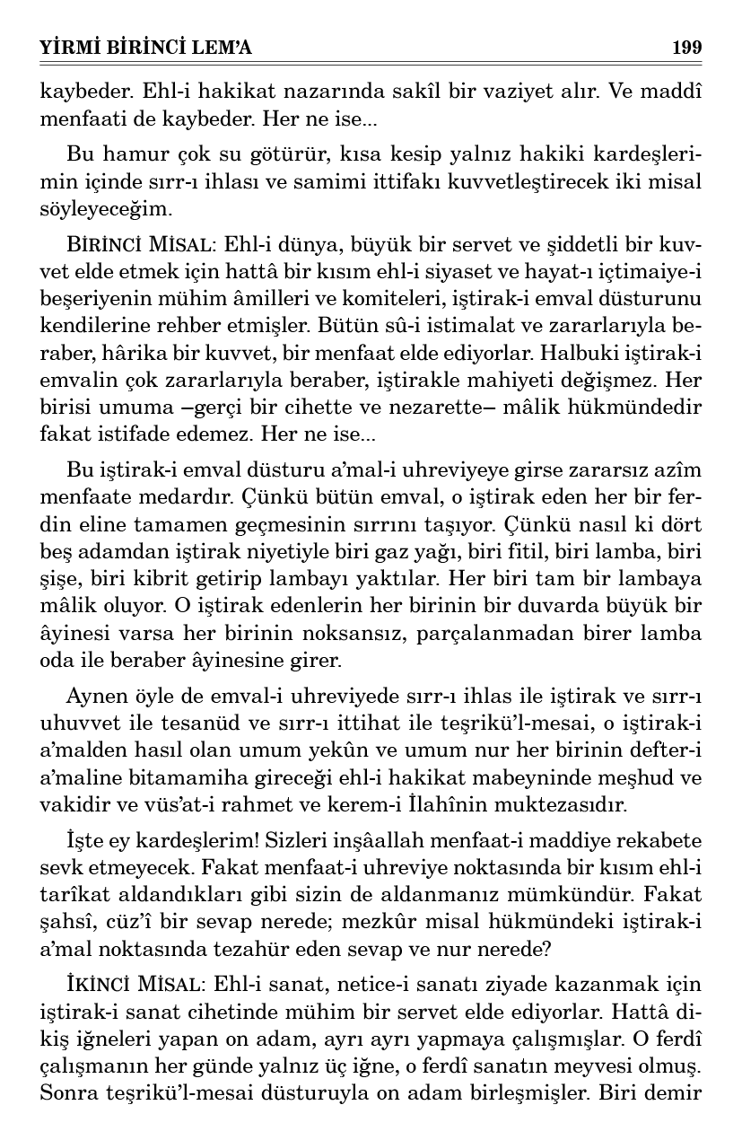 Bu iştirak-i emval düsturu a’mal-i uhreviyeye girse zararsız azîm menfaate medardır. Çünkü bütün emval, o iştirak eden her bir ferdin eline tamamen geçmesinin sırrını taşıyor. Çünkü nasıl ki dört beş adamdan iştirak niyetiyle biri gaz yağı, biri fitil, biri lamba, biri şişe, biri kibrit getirip lambayı yaktılar. Her biri tam bir lambaya mâlik oluyor. O iştirak edenlerin her birinin bir duvarda büyük bir âyinesi varsa her birinin noksansız, parçalanmadan birer lamba oda ile beraber âyinesine girer.