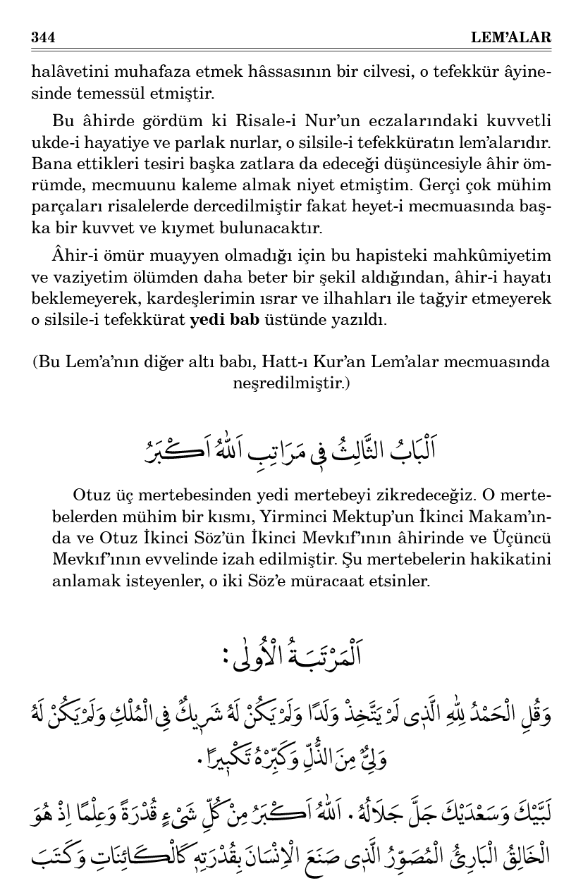 الْكَائِنَاتِ بِقَلَمِ قَدَرِهٖ كَمَا كَتَبَ الْاِنْسَانَ بِذٰلِكَ الْقَلَمِ اِذْ ذَاكَ الْعَالَمُ الْكَبٖيرُ كَهٰذَا الْعَالَمِ الصَّغٖيرِ مَصْنُوعُ قُدْرَتِهٖ مَكْتُوبُ قَدَرِهٖ اِبْدَاعُهُ لِذَاكَ صَيَّرَهُ مَسْجِدًا اٖيجَادُهُ لِهٰذَا صَيَّرَهُ سَاجِدًا اِنْشَائُهُ لِذَاكَ صَيَّرَ ذَاكَ مُلْكًا بِنَائُهُ لِهٰذَا صَيَّرَهُ مَمْلُوكًا صَنْعَتُهُ فٖى ذَاكَ تَظَاهَرَتْ كِتَابًا صِبْغَتُهُ فٖى هٰذَا تَزَاهَرَتْ خِطَابًا قُدْرَتُهُ فٖى ذَاكَ تُظْهِرُ حِشْمَتَهُ رَحْمَتُهُ فٖى هٰذَا تَنْظِمُ نِعْمَتَهُ حِشْمَتُهُ فٖى ذَاكَ تَشْهَدُ هُوَ الْوَاحِدُ نِعْمَتُهُ فٖى هٰذَا تُعْلِنُ هُوَ الْاَحَدُ سِكَّتُهُ فٖى ذَاكَ فِى الْكُلِّ وَالْاَجْزَاءِ سُكُونًا حَرَكَةً خَاتَمُهُ فٖى هٰذَا فِى الْجِسْمِ وَالْاَعْضَاءِ حُجَيْرَةً ذَرَّةً ٠