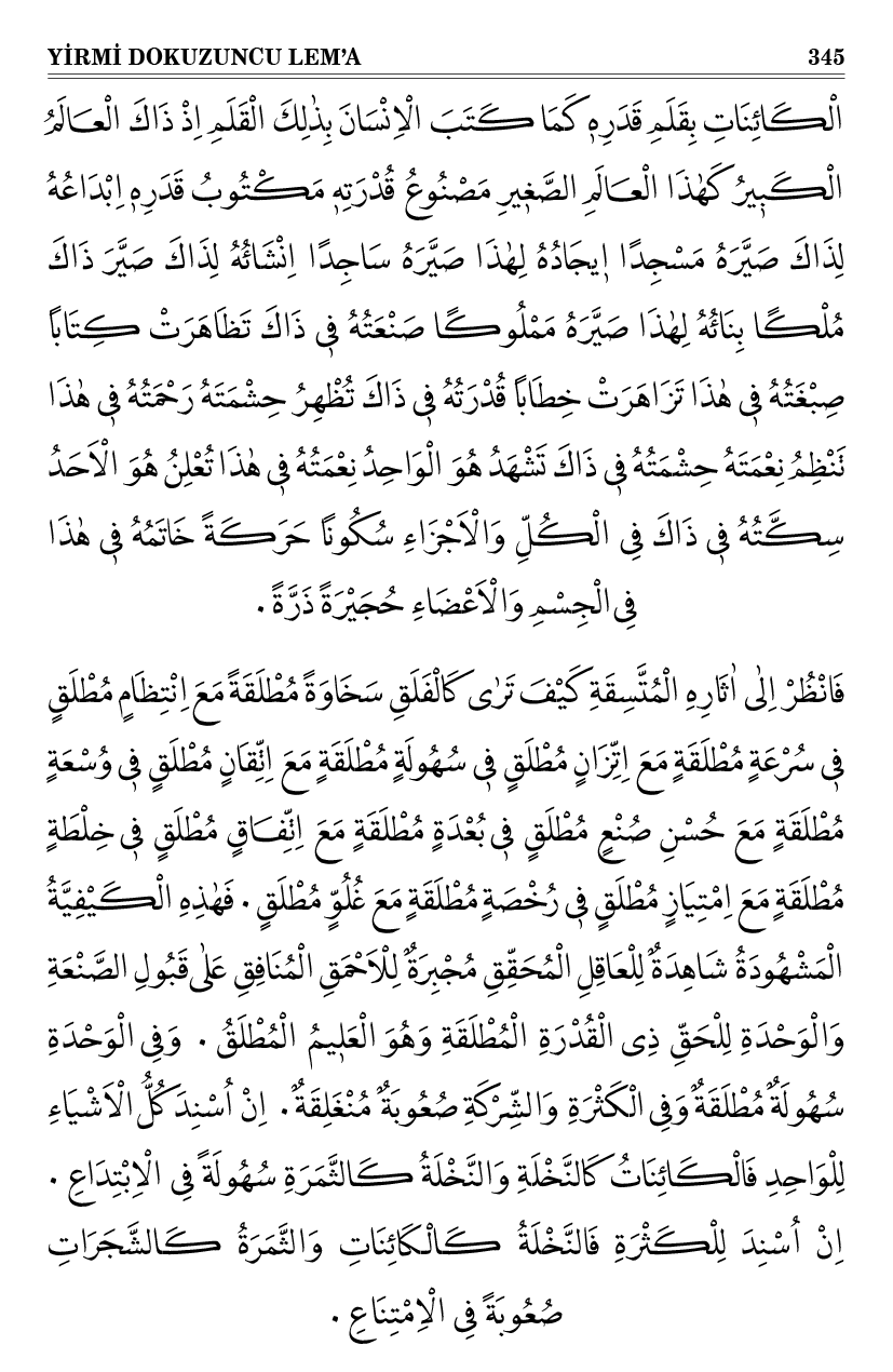فَانْظُرْ اِلٰى اٰثَارِهِ الْمُتَّسِقَةِ كَيْفَ تَرٰى كَالْفَلَقِ سَخَاوَةً مُطْلَقَةً مَعَ اِنْتِظَامٍ مُطْلَقٍ فٖى سُرْعَةٍ مُطْلَقَةٍ مَعَ اِتِّزَانٍ مُطْلَقٍ فٖى سُهُولَةٍ مُطْلَقَةٍ مَعَ اِتِّقَانٍ مُطْلَقٍ فٖى وُسْعَةٍ مُطْلَقَةٍ مَعَ حُسْنِ صُنْعٍ مُطْلَقٍ فٖى بُعْدَةٍ مُطْلَقَةٍ مَعَ اِتِّفَاقٍ مُطْلَقٍ فٖى خِلْطَةٍ مُطْلَقَةٍ مَعَ اِمْتِيَازٍ مُطْلَقٍ فٖى رُخْصَةٍ مُطْلَقَةٍ مَعَ غُلُوٍّ مُطْلَقٍ ٠ فَهٰذِهِ الْكَيْفِيَّةُ الْمَشْهُودَةُ شَاهِدَةٌ لِلْعَاقِلِ الْمُحَقِّقِ مُجْبِرَةٌ لِلْاَحْمَقِ الْمُنَافِقِ عَلٰى قَبُولِ الصَّنْعَةِ وَالْوَحْدَةِ لِلْحَقِّ ذِى الْقُدْرَةِ الْمُطْلَقَةِ وَهُوَ الْعَلٖيمُ الْمُطْلَقُ ٠ وَفِى الْوَحْدَةِ سُهُولَةٌ مُطْلَقَةٌ وَفِى الْكَثْرَةِ وَالشِّرْكَةِ صُعُوبَةٌ مُنْغَلِقَةٌ ٠ اِنْ اُسْنِدَ كُلُّ الْاَشْيَاءِ لِلْوَاحِدِ فَالْكَائِنَاتُ كَالنَّخْلَةِ وَالنَّخْلَةُ كَالثَّمَرَةِ سُهُولَةً فِى الْاِبْتِدَاعِ ٠ اِنْ اُسْنِدَ لِلْكَثْرَةِ فَالنَّخْلَةُ كَالْكَائِنَاتِ وَالثَّمَرَةُ كَالشَّجَرَاتِ صُعُوبَةً فِى الْاِمْتِنَاعِ ٠