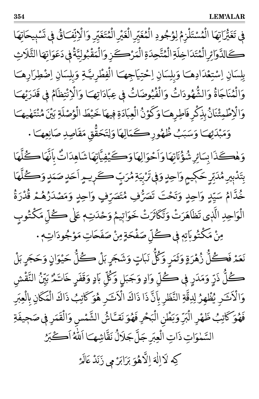 فَذٰلِكَ الْخَلَّاقُ الْقَدٖيرُ عَلٖيمٌ بِكُلِّ شَىْءٍ وَمُرٖيدٌ بِاِرَادَةٍ شَامِلَةٍ مَاشَاءَ كَانَ وَمَا لَمْ يَشَاْ لَمْ يَكُنْ وَهُوَ قَدٖيرٌ عَلٰى كُلِّ شَىْءٍ بِقُدْرَةٍ مُطْلَقَةٍ مُحٖيطَةٍ ذَاتِيَّةٍ وَكَمَا لَا يُمْكِنُ وَلَا يُتَصَوَّرُ وُجُودُ هٰذِهِ الشَّمْسِ فٖى هٰذَا الْيَوْمِ بِلَا ضِيَاءٍ وَلَا حَرَارَةٍ كَذٰلِكَ لَا يُمْكِنُ وَلَا يُتَصَوَّرُ وُجُودُ اِلٰهٍ خَالِقٍ للِسَّمٰوَاتِ بِلَا عِلْمٍ مُحٖيطٍ وَبِلَا قُدْرَةٍ مُطْلَقَةٍ فَهُوَ بِالضَّرُورَةِ عَلٖيمٌ بِكُلِّ شَىْءٍ بِعِلْمٍ مُحٖيطٍ لَازِمٍ ذَاتِىٍّ لِلذَّاتِ يَلْزَمُ تَعَلُّقُ ذٰلِكَ الْعِلْمِ بِكُلِّ الْاَشْيَاءِ لَا يُمْكِنُ اَنْ يَنْفَكَّ عَنْهُ شَىْءٌ بِسِرِّ الْحُضُورِ وَالشُّهُودِ وَالنُّفُوذِ وَالْاِحَاطَةِ النُّورَانِيَّةِ فَمَا يُشَاهَدُ