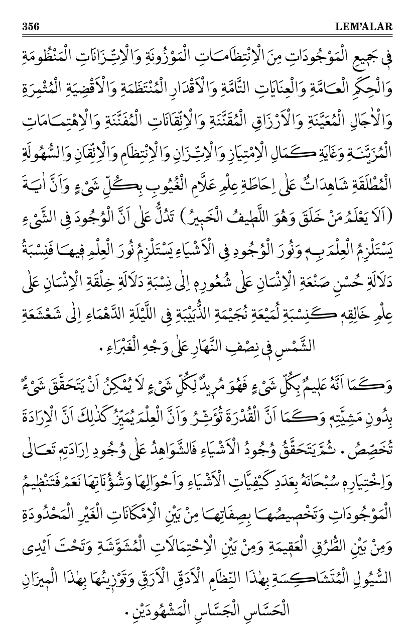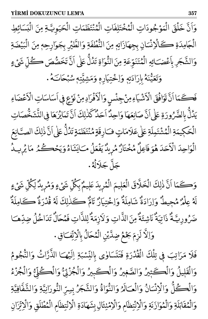 فَكَمَا اَنَّ تَوَافُقَ الْاَشْيَاءِ مِنْ جِنْسٍ وَالْاَفْرَادِ مِنْ نَوْعٍ فٖى اَسَاسَاتِ الْاَعْضَاءِ يَدُلُّ بِالضَّرُورَةِ عَلٰى اَنَّ صَانِعَهَا وَاحِدٌ اَحَدٌ كَذٰلِكَ اَنَّ تَمَايُزَهَا فِى التَّشَخُّصَاتِ الْحَكٖيمَةِ الْمُشْتَمِلَةِ عَلٰى عَلَامَاتٍ فَارِقَةٍ مُنْتَظَمَةٍ تَدُلُّ عَلٰى اَنَّ ذٰلِكَ الصَّانِعَ الْوَاحِدَ الْاَحَدَ هُوَ فَاعِلٌ مُخْتَارٌ مُرٖيدٌ يَفْعَلُ مَا يَشَاءُ وَيَحْكُمُ مَا يُرٖيدُ جَلَّ جَلَالُهُ ٠