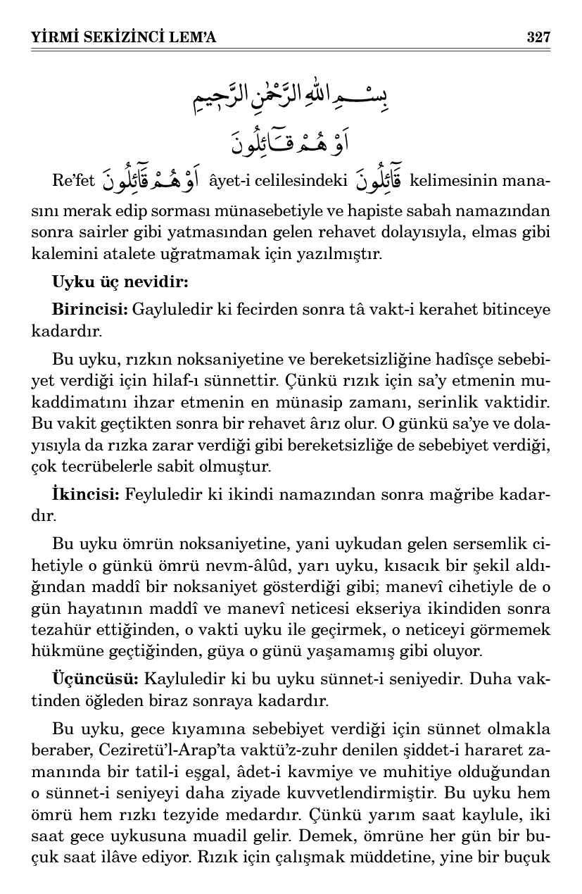 Re’fet اَوْ هُمْ قَٓائِلُونَ âyet-i celilesindeki قَٓائِلُونَ kelimesinin manasını merak edip sorması münasebetiyle ve hapiste sabah namazından sonra sairler gibi yatmasından gelen rehavet dolayısıyla, elmas gibi kalemini atalete uğratmamak için yazılmıştır.