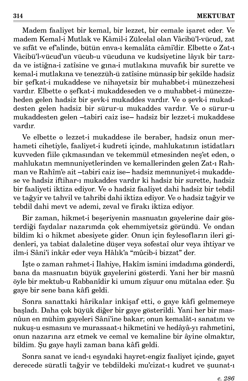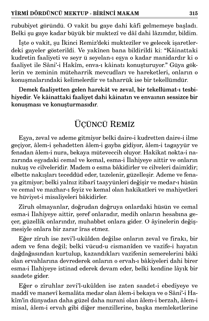Eşya, zeval ve ademe gitmiyor belki daire-i kudretten daire-i ilme geçiyor, âlem-i şehadetten âlem-i gayba gidiyor, âlem-i tagayyür ve fenadan âlem-i nura, bekaya müteveccih oluyor. Hakikat nokta-i nazarında eşyadaki cemal ve kemal, esma-i İlahiyeye aittir ve onların nukuş ve cilveleridir. Madem o esma bâkidirler ve cilveleri daimîdir; elbette nakışları teceddüd eder, tazelenir, güzelleşir. Ademe ve fenaya gitmiyor; belki yalnız itibarî taayyünleri değişir ve medar-ı hüsün ve cemal ve mazhar-ı feyiz ve kemal olan hakikatleri ve mahiyetleri ve hüviyet-i misaliyeleri bâkidirler.