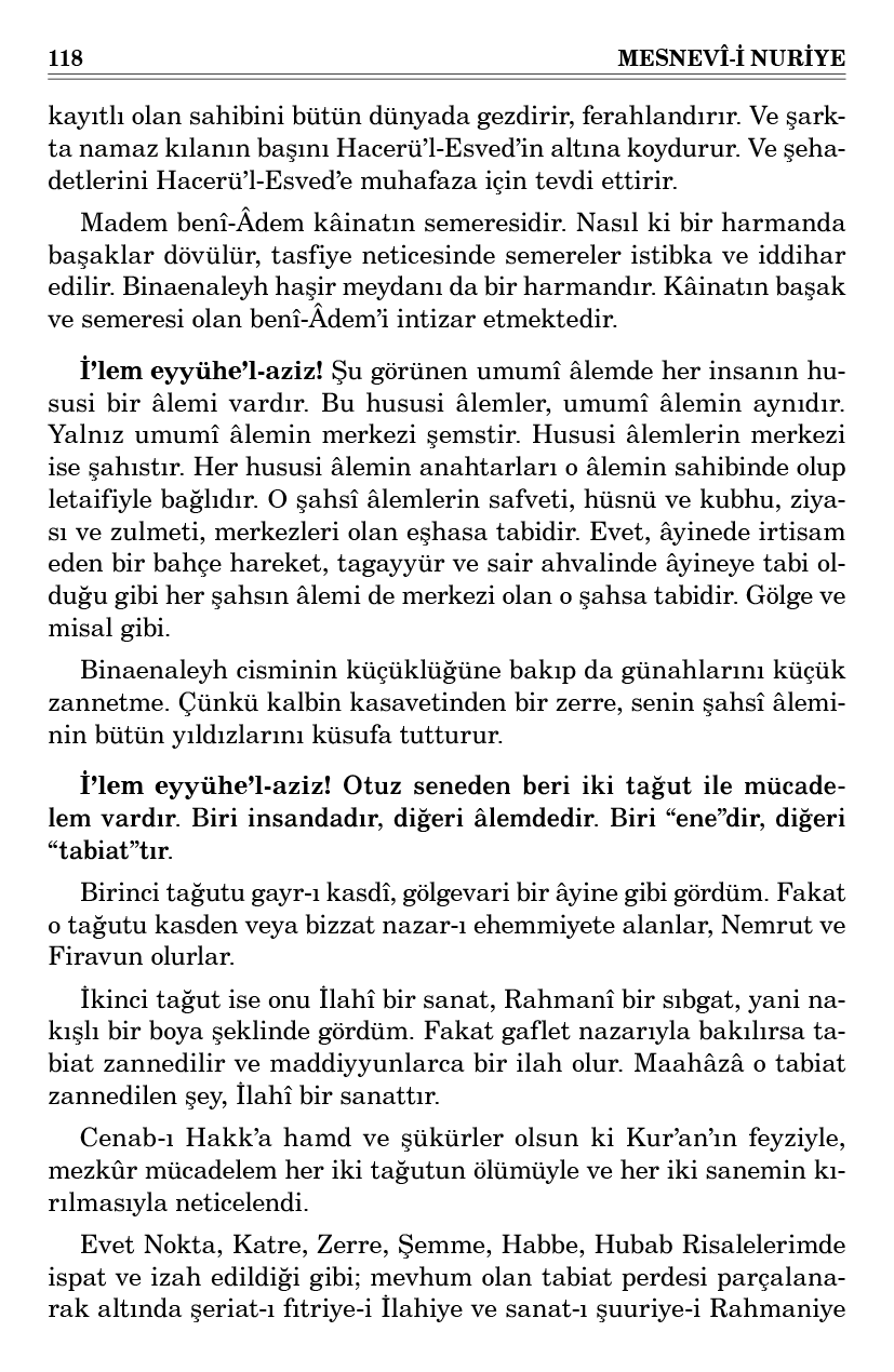 İ’lem eyyühe’l-aziz! Otuz seneden beri iki tağut ile mücadelem vardır. Biri insandadır, diğeri âlemdedir. Biri “ene”dir, diğeri “tabiat”tır.