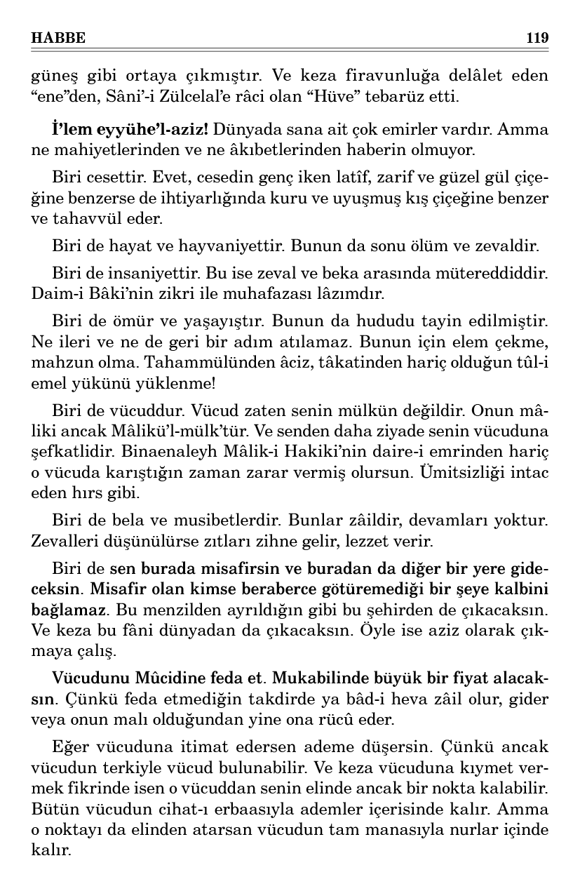 Binaenaleyh cisminin küçüklüğüne bakıp da günahlarını küçük zannetme. Çünkü kalbin kasavetinden bir zerre, senin şahsî âleminin bütün yıldızlarını küsufa tutturur.