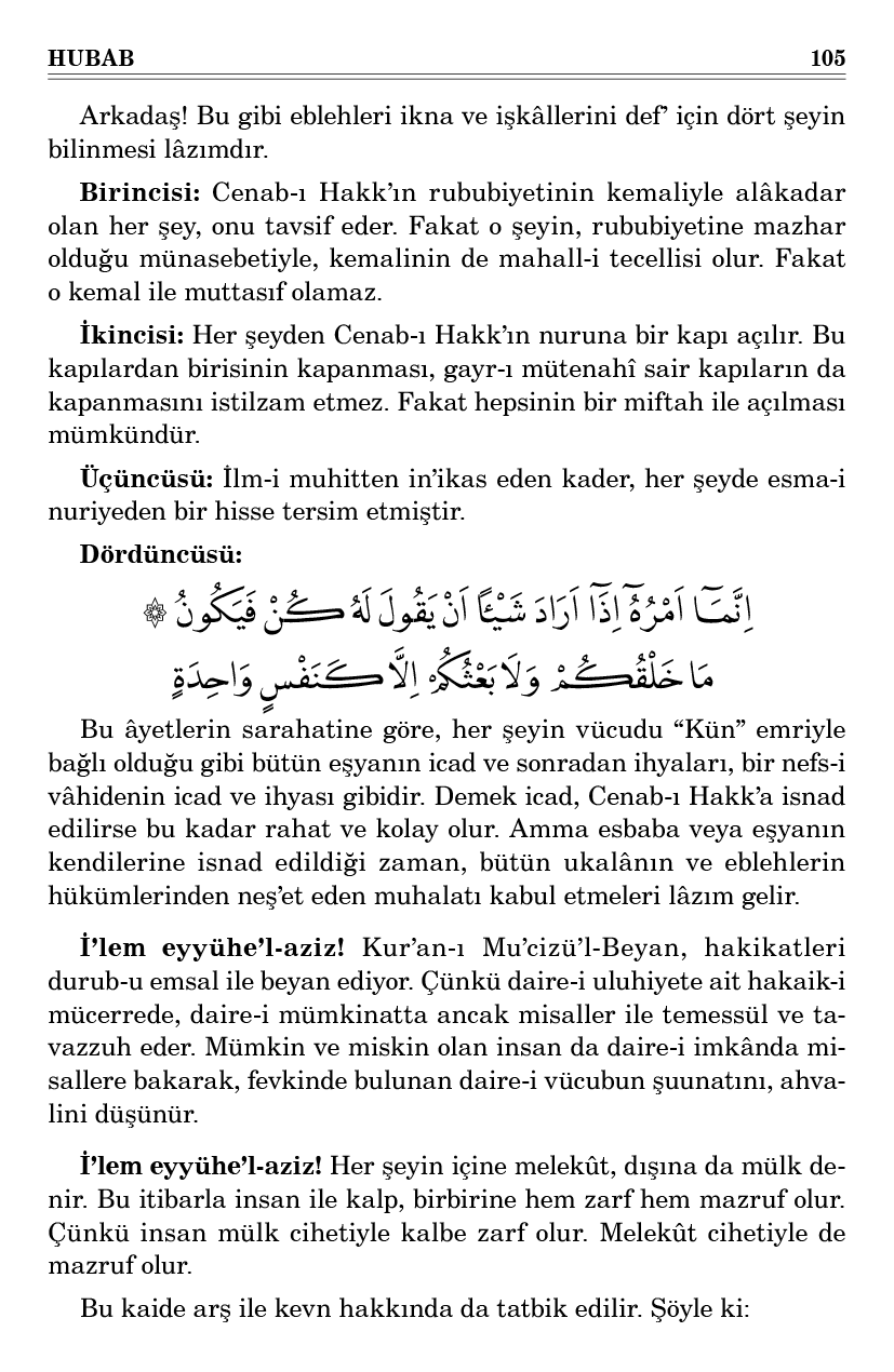 Bu âyetlerin sarahatine göre, her şeyin vücudu “Kün” emriyle bağlı olduğu gibi bütün eşyanın icad ve sonradan ihyaları, bir nefs-i vâhidenin icad ve ihyası gibidir. Demek icad, Cenab-ı Hakk’a isnad edilirse bu kadar rahat ve kolay olur. Amma esbaba veya eşyanın kendilerine isnad edildiği zaman, bütün ukalânın ve eblehlerin hükümlerinden neş’et eden muhalatı kabul etmeleri lâzım gelir.