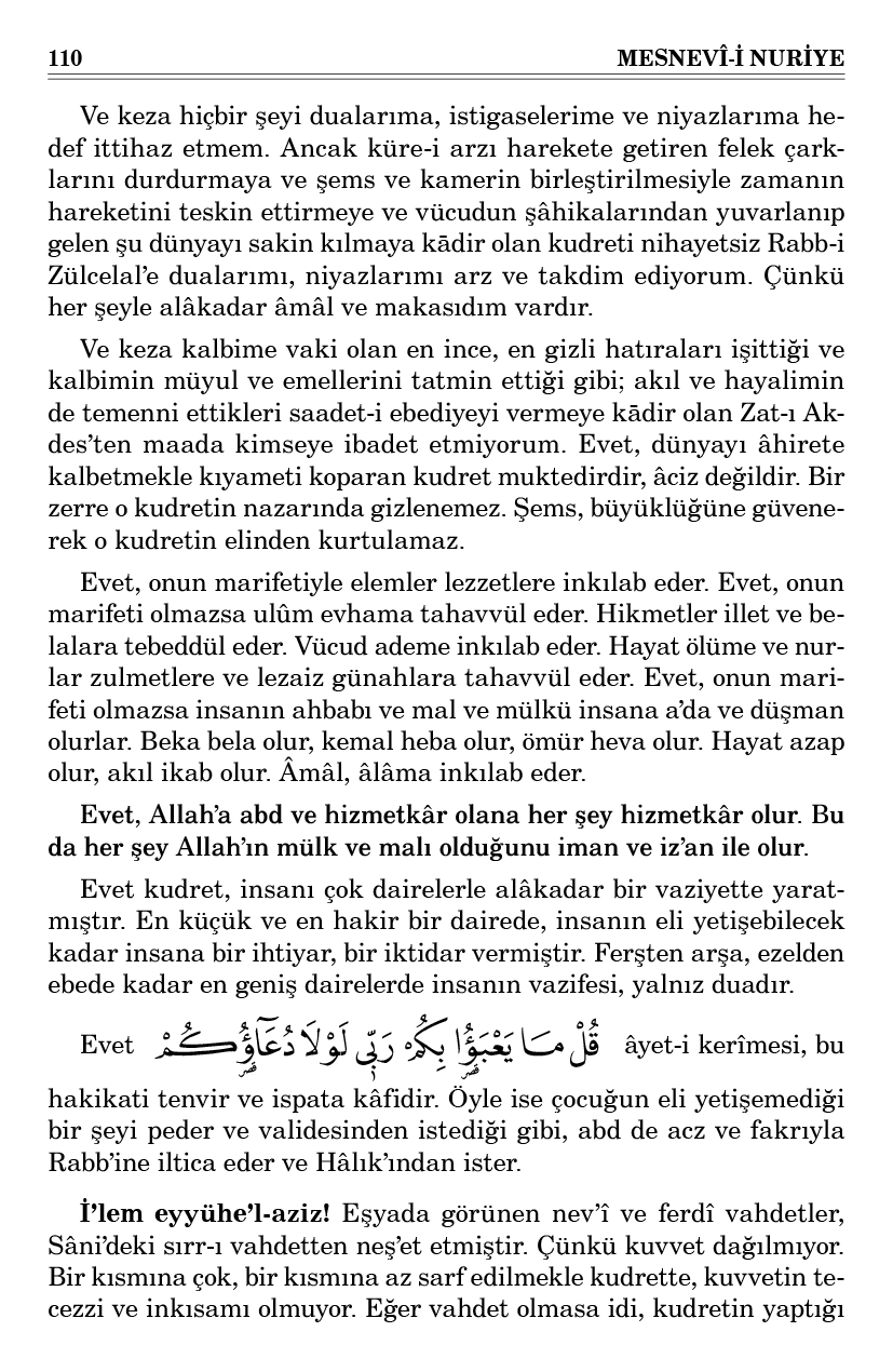 Ve keza hiçbir şeyi dualarıma, istigaselerime ve niyazlarıma hedef ittihaz etmem. Ancak küre-i arzı harekete getiren felek çarklarını durdurmaya ve şems ve kamerin birleştirilmesiyle zamanın hareketini teskin ettirmeye ve vücudun şâhikalarından yuvarlanıp gelen şu dünyayı sakin kılmaya kādir olan kudreti nihayetsiz Rabb-i Zülcelal’e dualarımı, niyazlarımı arz ve takdim ediyorum. Çünkü her şeyle alâkadar âmâl ve makasıdım vardır.