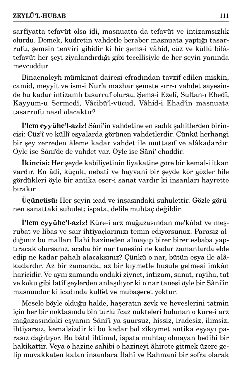 İ’lem eyyühe’l-aziz! Eşyada görünen nev’î ve ferdî vahdetler, Sâni’deki sırr-ı vahdetten neş’et etmiştir. Çünkü kuvvet dağılmıyor. Bir kısmına çok, bir kısmına az sarf edilmekle kudrette, kuvvetin tecezzi ve inkısamı olmuyor. Eğer vahdet olmasa idi, kudretin yaptığı