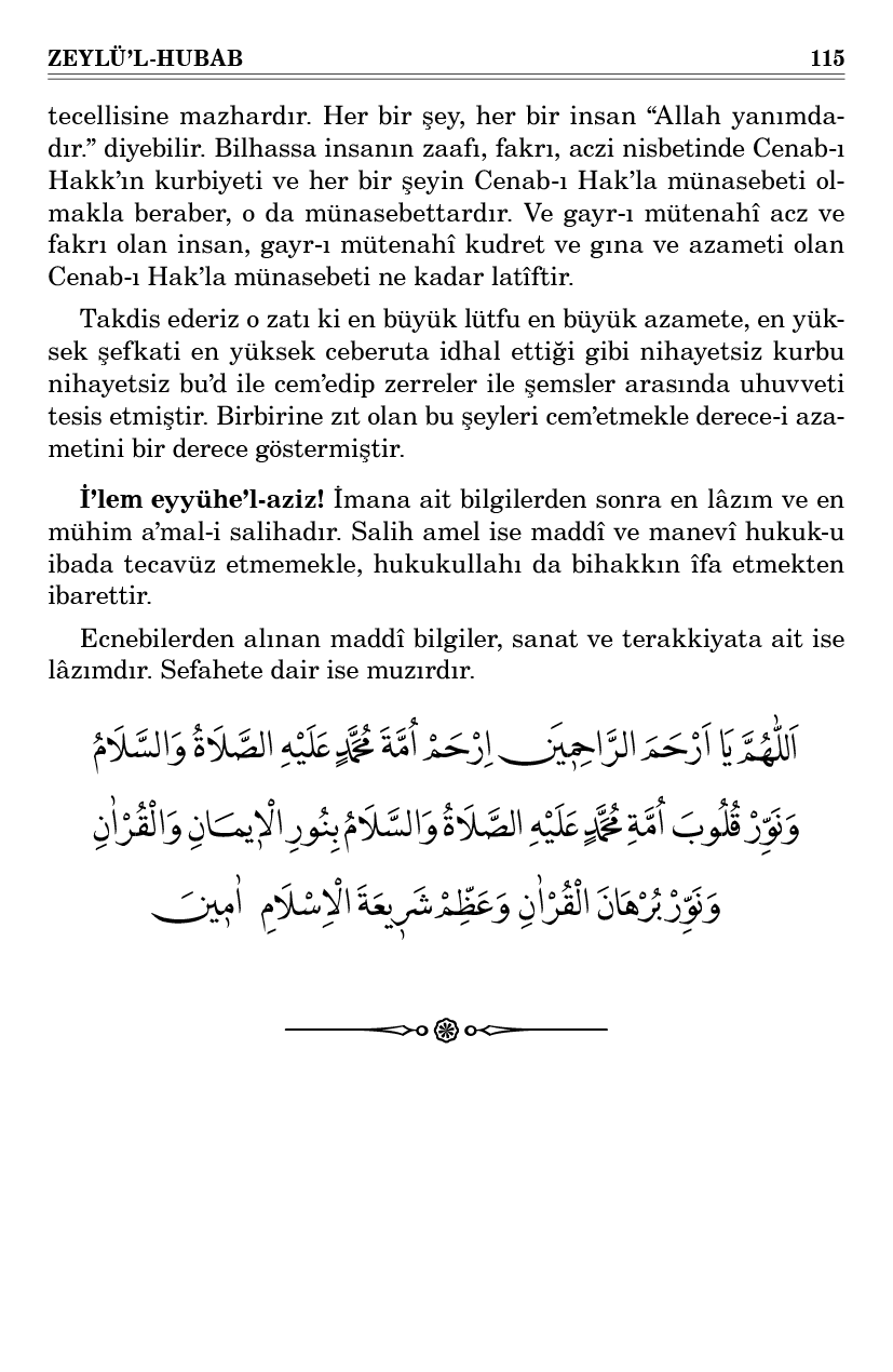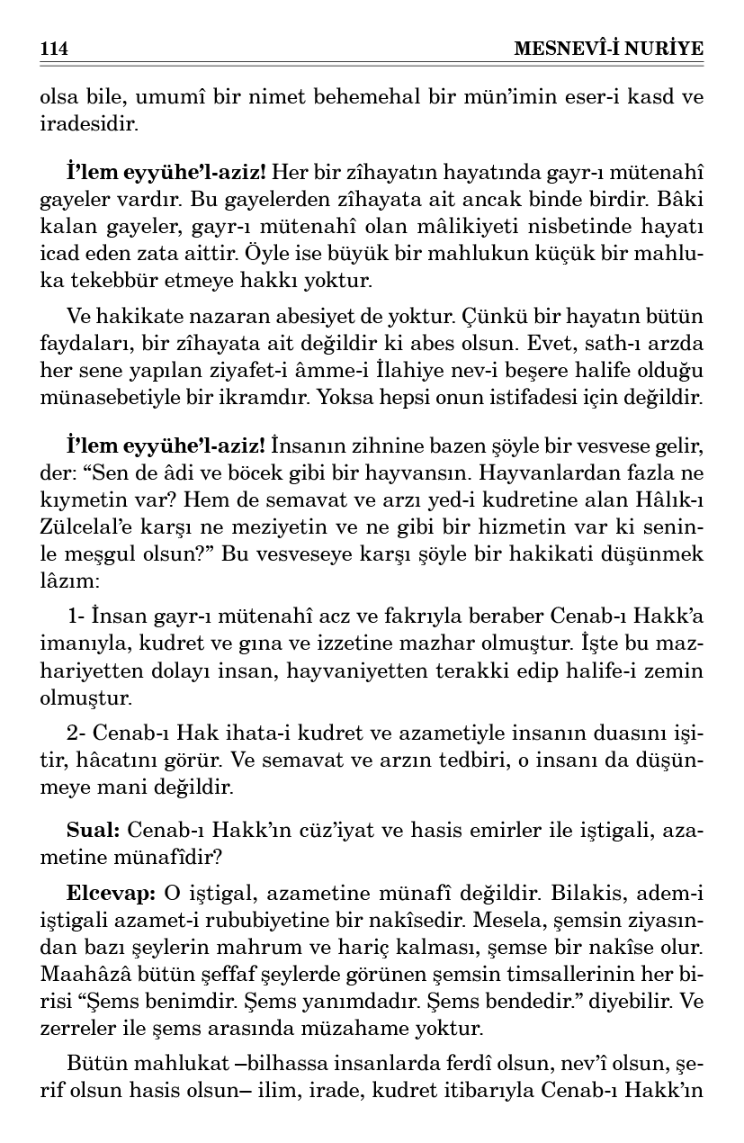 İ’lem eyyühe’l-aziz! Her bir zîhayatın hayatında gayr-ı mütenahî gayeler vardır. Bu gayelerden zîhayata ait ancak binde birdir. Bâki kalan gayeler, gayr-ı mütenahî olan mâlikiyeti nisbetinde hayatı icad eden zata aittir. Öyle ise büyük bir mahlukun küçük bir mahluka tekebbür etmeye hakkı yoktur.