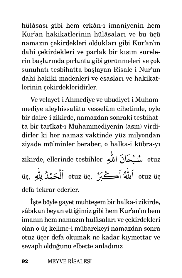 Ve velayet-i Ahmediye ve ubudiyet-i Muhammediye aleyhissalâtü vesselâm cihetinde, öyle bir daire-i zikirde, namazdan sonraki tesbihatta bir tarîkat-ı Muhammediyenin (asm) virdidirler ki her namaz vaktinde yüz milyondan ziyade mü’minler beraber, o halka-i kübra-yı zikirde, ellerinde tesbihler سُبْحَانَ اللّٰهِ otuz üç, اَلْحَمْدُ لِلّٰهِ otuz üç, اَللّٰهُ اَكْبَرُ otuz üç defa tekrar ederler.