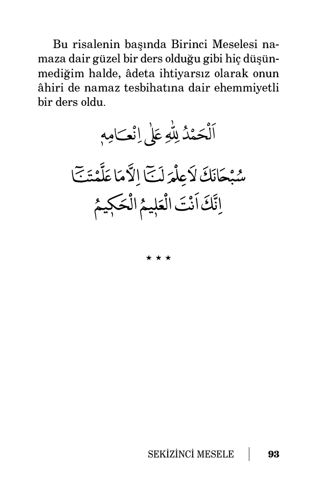 İşte böyle gayet muhteşem bir halka-i zikirde, sâbıkan beyan ettiğimiz gibi hem Kur’an’ın hem imanın hem namazın hülâsaları ve çekirdekleri olan o üç kelime-i mübarekeyi namazdan sonra otuz üçer defa okumak ne kadar kıymettar ve sevaplı olduğunu elbette anladınız.