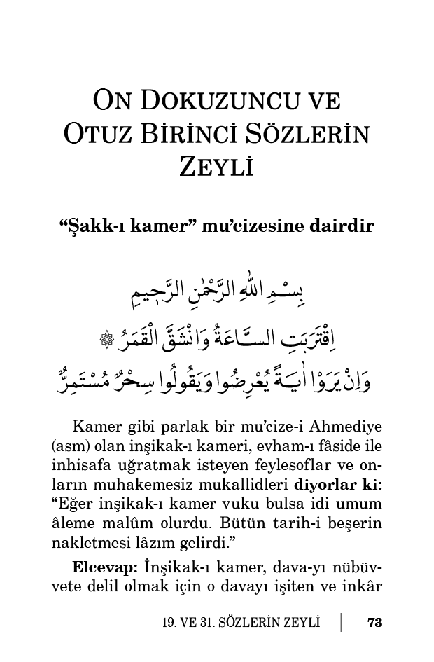 Kamer gibi parlak bir mu’cize-i Ahmediye (asm) olan inşikak-ı kameri, evham-ı fâside ile inhisafa uğratmak isteyen feylesoflar ve onların muhakemesiz mukallidleri diyorlar ki: “Eğer inşikak-ı kamer vuku bulsa idi umum âleme malûm olurdu. Bütün tarih-i beşerin nakletmesi lâzım gelirdi.”