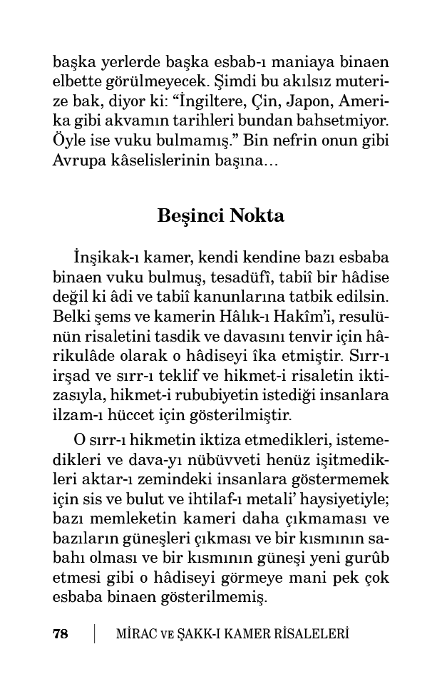 Beşinci Nokta: İnşikak-ı kamer, kendi kendine bazı esbaba binaen vuku bulmuş, tesadüfî, tabiî bir hâdise değil ki âdi ve tabiî kanunlarına tatbik edilsin. Belki şems ve kamerin Hâlık-ı Hakîm’i, resulünün risaletini tasdik ve davasını tenvir için hârikulâde olarak o hâdiseyi îka etmiştir. Sırr-ı irşad ve sırr-ı teklif ve hikmet-i risaletin iktizasıyla, hikmet-i rububiyetin istediği insanlara ilzam-ı hüccet için gösterilmiştir.
