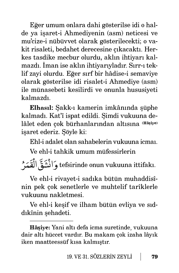 O sırr-ı hikmetin iktiza etmedikleri, istemedikleri ve dava-yı nübüvveti henüz işitmedikleri aktar-ı zemindeki insanlara göstermemek için sis ve bulut ve ihtilaf-ı metali’ haysiyetiyle; bazı memleketin kameri daha çıkmaması ve bazıların güneşleri çıkması ve bir kısmının sabahı olması ve bir kısmının güneşi yeni gurûb etmesi gibi o hâdiseyi görmeye mani pek çok esbaba binaen gösterilmemiş.