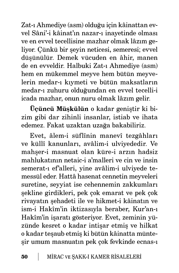 Zat-ı Ahmediye (asm) olduğu için kâinattan evvel Sâni’-i kâinat’ın nazar-ı inayetinde olması ve en evvel tecellisine mazhar olmak lâzım geliyor. Çünkü bir şeyin neticesi, semeresi; evvel düşünülür. Demek vücuden en âhir, manen de en evveldir. Halbuki Zat-ı Ahmediye (asm) hem en mükemmel meyve hem bütün meyvelerin medar-ı kıymeti ve bütün maksatların medar-ı zuhuru olduğundan en evvel tecelli-i icada mazhar, onun nuru olmak lâzım gelir.