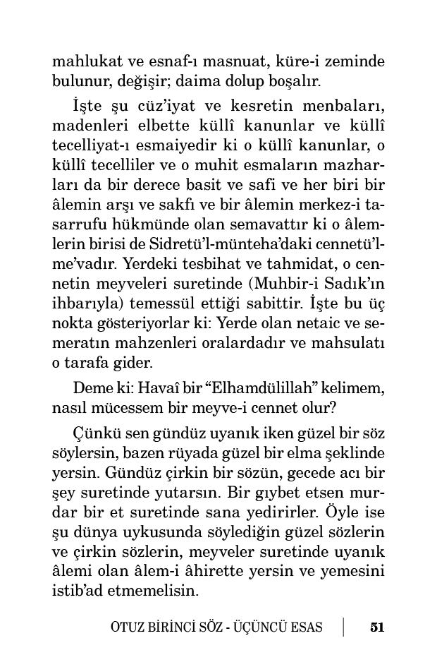 Evet, âlem-i süflînin manevî tezgâhları ve küllî kanunları, avâlim-i ulviyededir. Ve mahşer-i masnuat olan küre-i arzın hadsiz mahlukatının netaic-i a’malleri ve cin ve insin semerat-ı ef’alleri, yine avâlim-i ulviyede temessül eder. Hattâ hasenat cennetin meyveleri suretine, seyyiat ise cehennemin zakkumları şekline girdikleri, pek çok emarat ve pek çok rivayatın şehadeti ile ve hikmet-i kâinatın ve ism-i Hakîm’in iktizasıyla beraber, Kur’an-ı Hakîm’in işaratı gösteriyor. Evet, zeminin yüzünde kesret o kadar intişar etmiş ve hilkat o kadar teşaub etmiş ki bütün kâinatta münteşir umum masnuatın pek çok fevkinde ecnas-ı