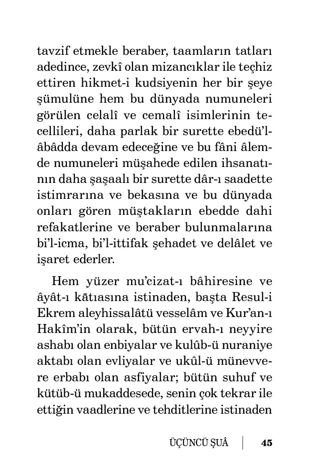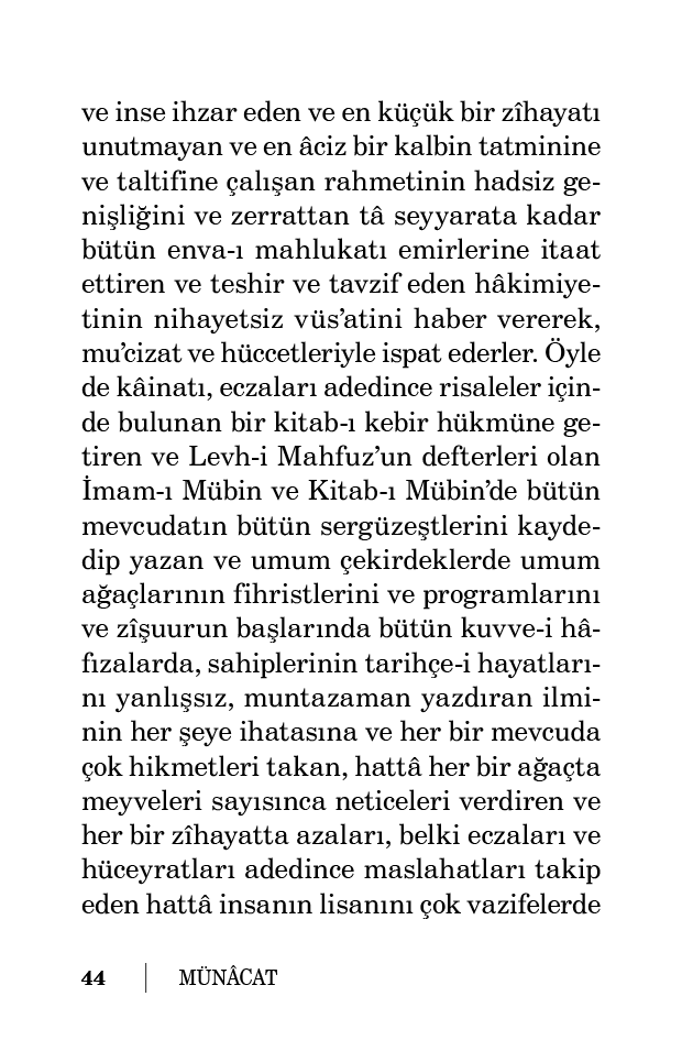 ve inse ihzar eden ve en küçük bir zîhayatı unutmayan ve en âciz bir kalbin tatminine ve taltifine çalışan rahmetinin hadsiz genişliğini ve zerrattan tâ seyyarata kadar bütün enva-ı mahlukatı emirlerine itaat ettiren ve teshir ve tavzif eden hâkimiyetinin nihayetsiz vüs’atini haber vererek, mu’cizat ve hüccetleriyle ispat ederler. Öyle de kâinatı, eczaları adedince risaleler içinde bulunan bir kitab-ı kebir hükmüne getiren ve Levh-i Mahfuz’un defterleri olan İmam-ı Mübin ve Kitab-ı Mübin’de bütün mevcudatın bütün sergüzeştlerini kaydedip yazan ve umum çekirdeklerde umum ağaçlarının fihristlerini ve programlarını ve zîşuurun başlarında bütün kuvve-i hâfızalarda, sahiplerinin tarihçe-i hayatlarını yanlışsız, muntazaman yazdıran ilminin her şeye ihatasına ve her bir mevcuda çok hikmetleri takan, hattâ her bir ağaçta meyveleri sayısınca neticeleri verdiren ve her bir zîhayatta azaları, belki eczaları ve hüceyratları adedince maslahatları takip eden hattâ insanın lisanını çok vazifelerde