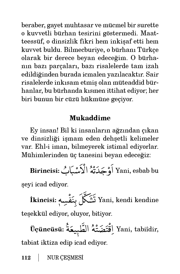 Esbab-ı âlemin içtimaıyla teşkil-i eşya ve vücud-u mahlukattır. Pek çok muhalatından yalnız üç tanesini zikrediyoruz.
