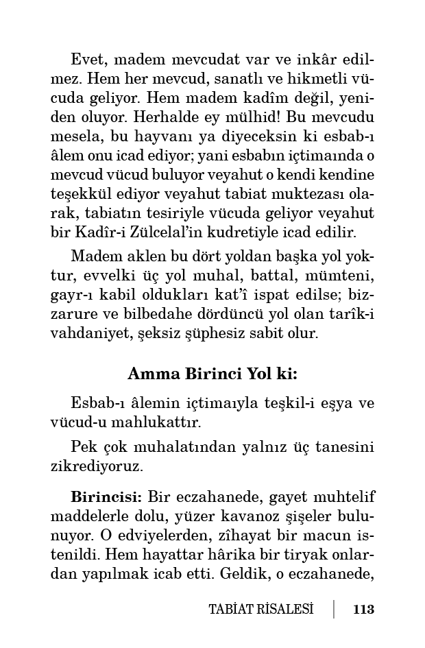 Madem aklen bu dört yoldan başka yol yoktur, evvelki üç yol muhal, battal, mümteni, gayr-ı kabil oldukları kat’î ispat edilse; bizzarure ve bilbedahe dördüncü yol olan tarîk-i vahdaniyet, şeksiz şüphesiz sabit olur.