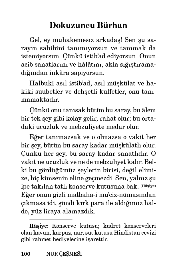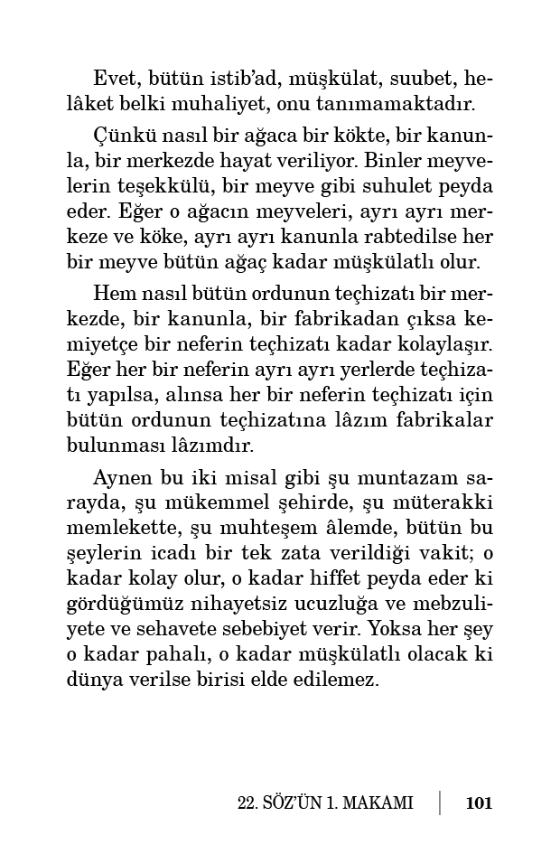 Evet, bütün istib’ad, müşkülat, suubet, helâket belki muhaliyet, onu tanımamaktadır. Çünkü nasıl bir ağaca bir kökte, bir kanunla, bir merkezde hayat veriliyor. Binler meyvelerin teşekkülü, bir meyve gibi suhulet peyda eder. Eğer o ağacın meyveleri, ayrı ayrı merkeze ve köke, ayrı ayrı kanunla rabtedilse her bir meyve bütün ağaç kadar müşkülatlı olur.