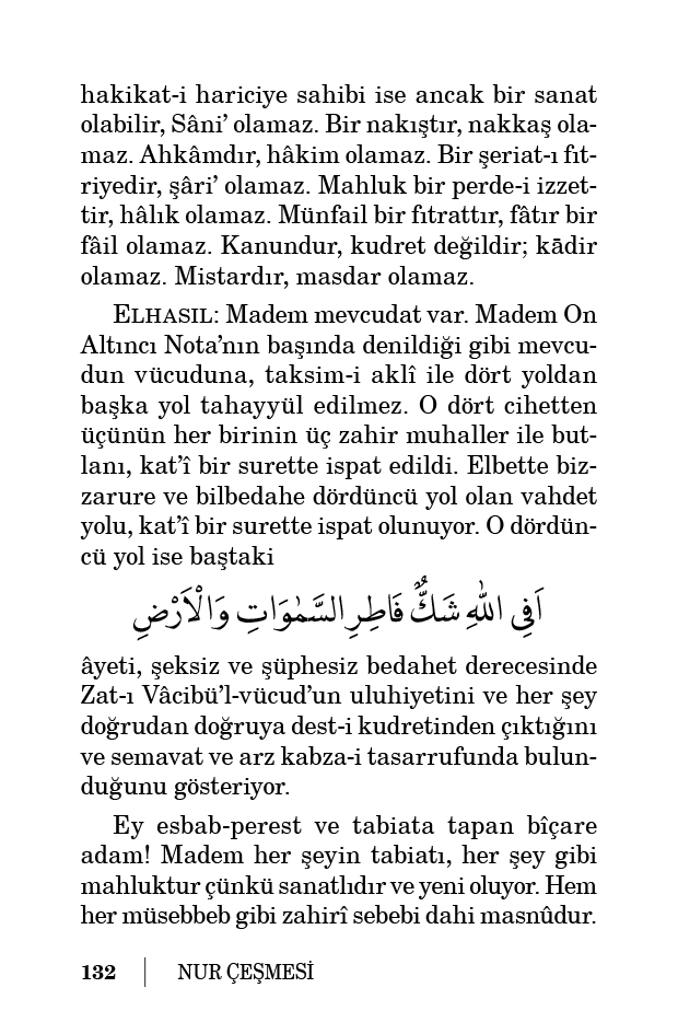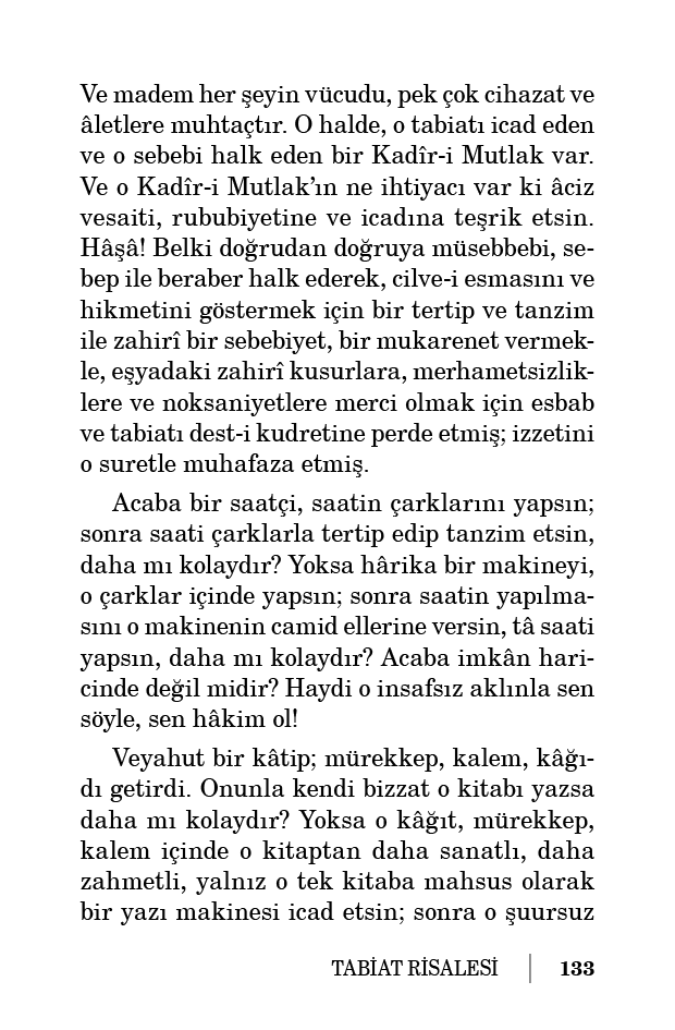 Ve madem her şeyin vücudu, pek çok cihazat ve âletlere muhtaçtır. O halde, o tabiatı icad eden ve o sebebi halk eden bir Kadîr-i Mutlak var. Ve o Kadîr-i Mutlak’ın ne ihtiyacı var ki âciz vesaiti, rububiyetine ve icadına teşrik etsin. Hâşâ! Belki doğrudan doğruya müsebbebi, sebep ile beraber halk ederek, cilve-i esmasını ve hikmetini göstermek için bir tertip ve tanzim ile zahirî bir sebebiyet, bir mukarenet vermekle, eşyadaki zahirî kusurlara, merhametsizliklere ve noksaniyetlere merci olmak için esbab ve tabiatı dest-i kudretine perde etmiş; izzetini o suretle muhafaza etmiş.