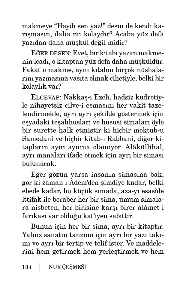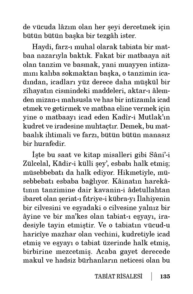 Haydi, farz-ı muhal olarak tabiata bir matbaa nazarıyla baktık. Fakat bir matbaaya ait olan tanzim ve basmak, yani muayyen intizamını kalıba sokmaktan başka, o tanzimin icadından, icadları yüz derece daha müşkül bir zîhayatın cismindeki maddeleri, aktar-ı âlemden mizan-ı mahsusla ve has bir intizamla icad etmek ve getirmek ve matbaa eline vermek için yine o matbaayı icad eden Kadîr-i Mutlak’ın kudret ve iradesine muhtaçtır. Demek, bu matbaalık ihtimali ve farzı, bütün bütün manasız bir hurafedir.