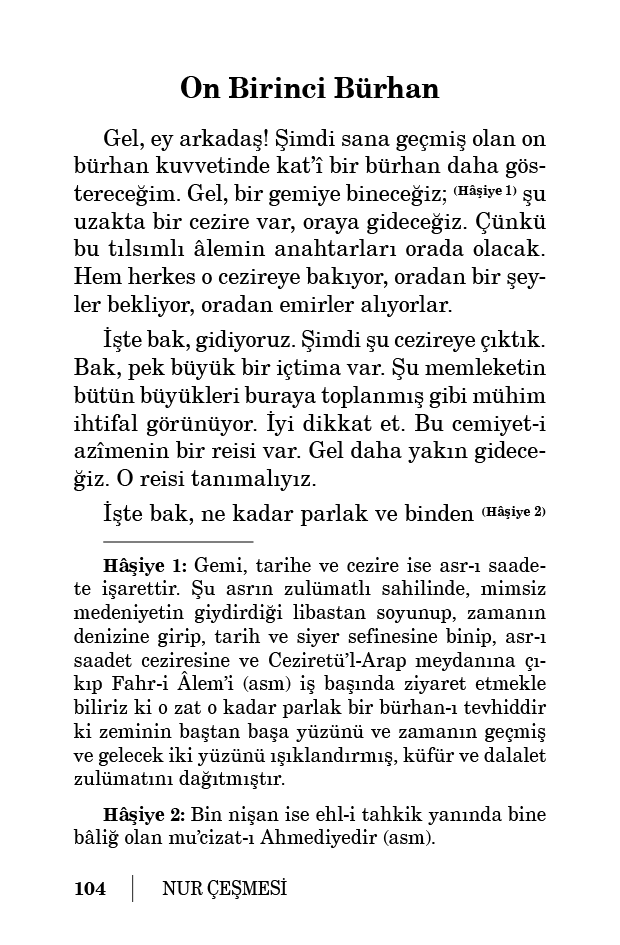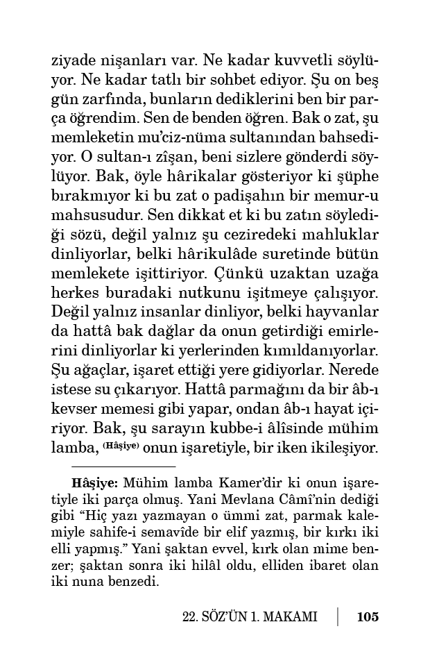 ziyade nişanları var. Ne kadar kuvvetli söylüyor. Ne kadar tatlı bir sohbet ediyor. Şu on beş gün zarfında, bunların dediklerini ben bir parça öğrendim. Sen de benden öğren. Bak o zat, şu memleketin mu’ciz-nüma sultanından bahsediyor. O sultan-ı zîşan, beni sizlere gönderdi söylüyor. Bak, öyle hârikalar gösteriyor ki şüphe bırakmıyor ki bu zat o padişahın bir memur-u mahsusudur. Sen dikkat et ki bu zatın söylediği sözü, değil yalnız şu ceziredeki mahluklar dinliyorlar, belki hârikulâde suretinde bütün memlekete işittiriyor. Çünkü uzaktan uzağa herkes buradaki nutkunu işitmeye çalışıyor. Değil yalnız insanlar dinliyor, belki hayvanlar da hattâ bak dağlar da onun getirdiği emirlerini dinliyorlar ki yerlerinden kımıldanıyorlar. Şu ağaçlar, işaret ettiği yere gidiyorlar. Nerede istese su çıkarıyor. Hattâ parmağını da bir âb-ı kevser memesi gibi yapar, ondan âb-ı hayat içiriyor. Bak, şu sarayın kubbe-i âlîsinde mühim lamba, (Hâşiye) onun işaretiyle, bir iken ikileşiyor.