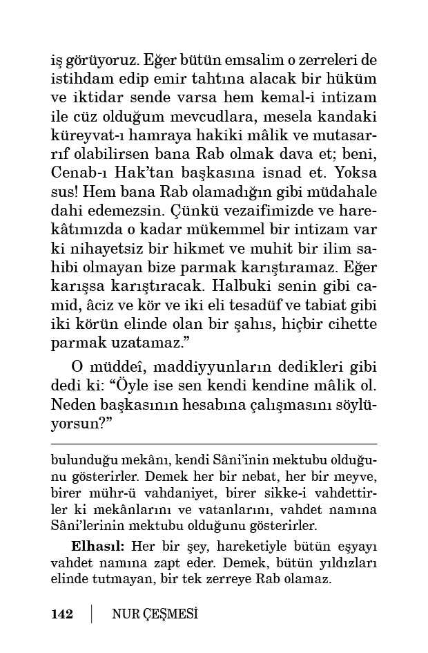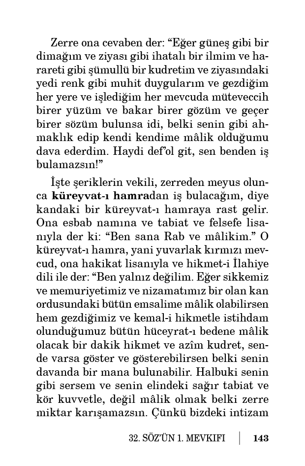 İşte şeriklerin vekili, zerreden meyus olunca küreyvat-ı hamradan iş bulacağım, diye kandaki bir küreyvat-ı hamraya rast gelir. Ona esbab namına ve tabiat ve felsefe lisanıyla der ki: “Ben sana Rab ve mâlikim.” O küreyvat-ı hamra, yani yuvarlak kırmızı mevcud, ona hakikat lisanıyla ve hikmet-i İlahiye dili ile der: “Ben yalnız değilim. Eğer sikkemiz ve memuriyetimiz ve nizamatımız bir olan kan ordusundaki bütün emsalime mâlik olabilirsen hem gezdiğimiz ve kemal-i hikmetle istihdam olunduğumuz bütün hüceyrat-ı bedene mâlik olacak bir dakik hikmet ve azîm kudret, sende varsa göster ve gösterebilirsen belki senin davanda bir mana bulunabilir. Halbuki senin gibi sersem ve senin elindeki sağır tabiat ve kör kuvvetle, değil mâlik olmak belki zerre miktar karışamazsın. Çünkü bizdeki intizam