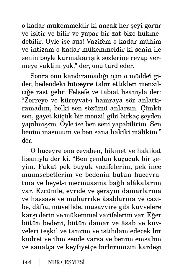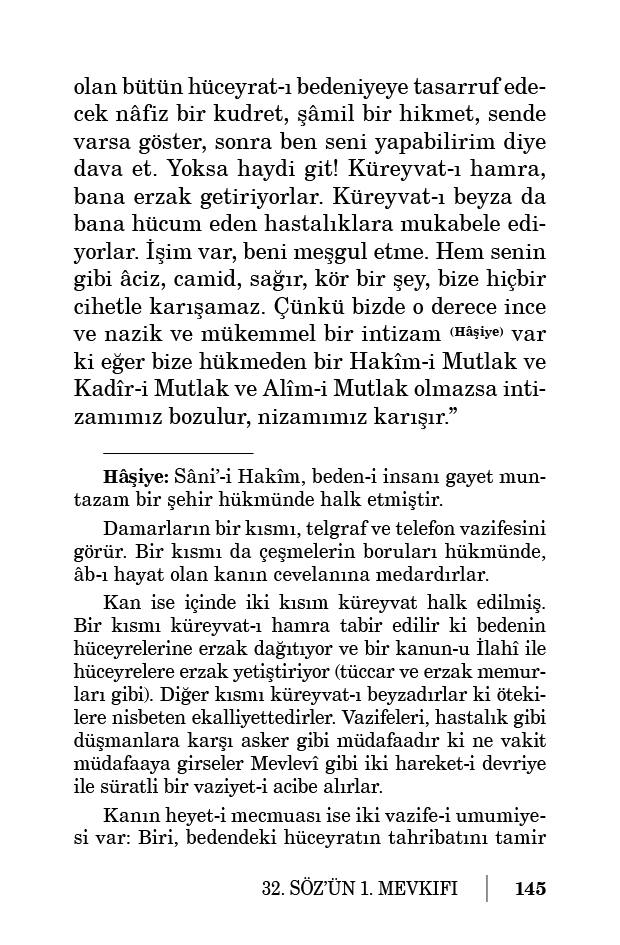 olan bütün hüceyrat-ı bedeniyeye tasarruf edecek nâfiz bir kudret, şâmil bir hikmet, sende varsa göster, sonra ben seni yapabilirim diye dava et. Yoksa haydi git! Küreyvat-ı hamra, bana erzak getiriyorlar. Küreyvat-ı beyza da bana hücum eden hastalıklara mukabele ediyorlar. İşim var, beni meşgul etme. Hem senin gibi âciz, camid, sağır, kör bir şey, bize hiçbir cihetle karışamaz. Çünkü bizde o derece ince ve nazik ve mükemmel bir intizam (Hâşiye) var ki eğer bize hükmeden bir Hakîm-i Mutlak ve Kadîr-i Mutlak ve Alîm-i Mutlak olmazsa intizamımız bozulur, nizamımız karışır.”
