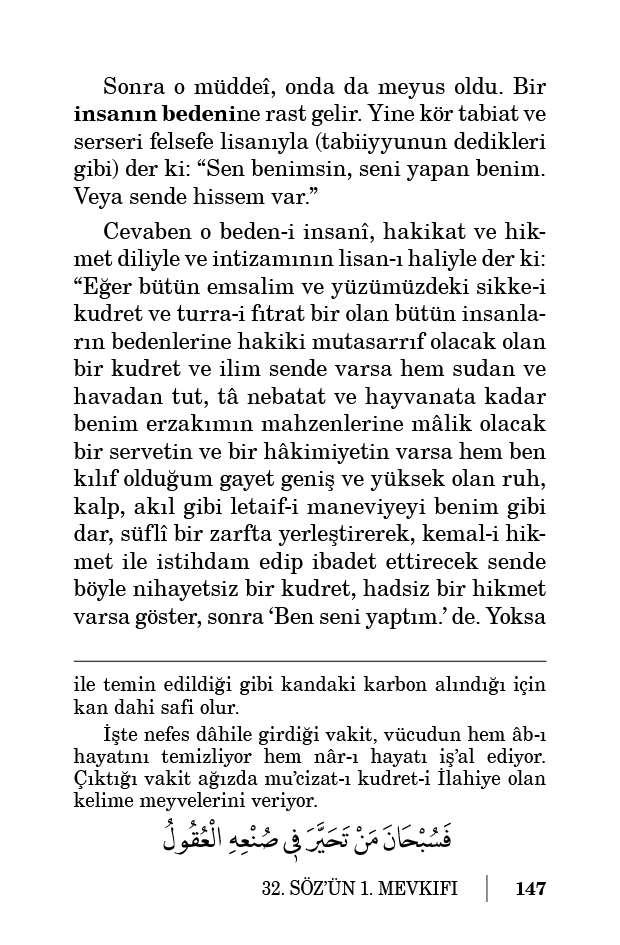 Cevaben o beden-i insanî, hakikat ve hikmet diliyle ve intizamının lisan-ı haliyle der ki: “Eğer bütün emsalim ve yüzümüzdeki sikke-i kudret ve turra-i fıtrat bir olan bütün insanların bedenlerine hakiki mutasarrıf olacak olan bir kudret ve ilim sende varsa hem sudan ve havadan tut, tâ nebatat ve hayvanata kadar benim erzakımın mahzenlerine mâlik olacak bir servetin ve bir hâkimiyetin varsa hem ben kılıf olduğum gayet geniş ve yüksek olan ruh, kalp, akıl gibi letaif-i maneviyeyi benim gibi dar, süflî bir zarfta yerleştirerek, kemal-i hikmet ile istihdam edip ibadet ettirecek sende böyle nihayetsiz bir kudret, hadsiz bir hikmet varsa göster, sonra ‘Ben seni yaptım.’ de. Yoksa