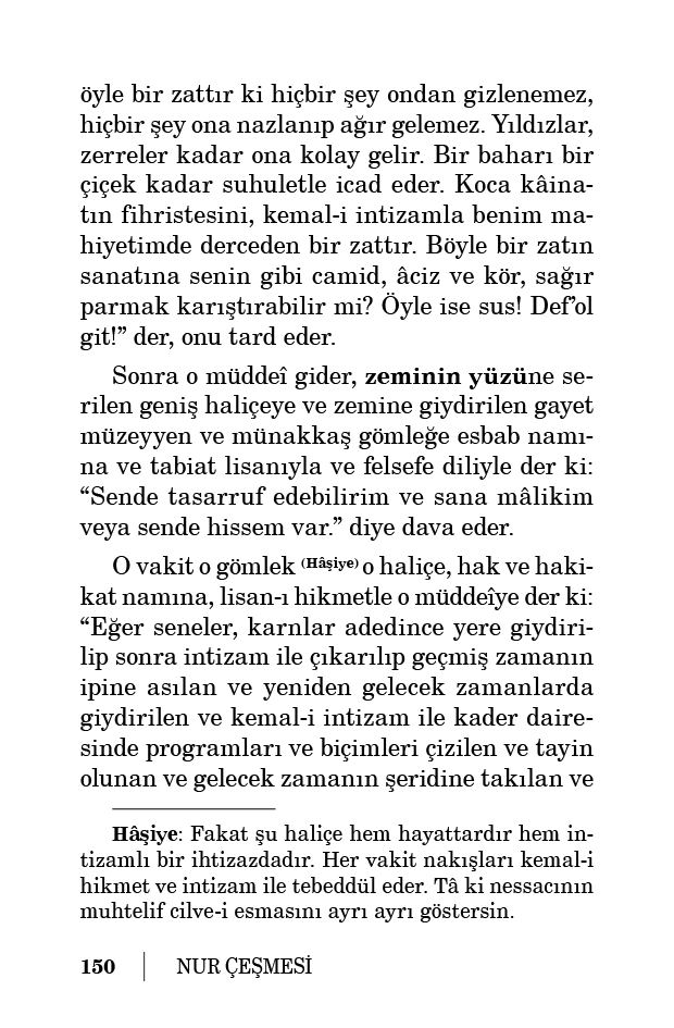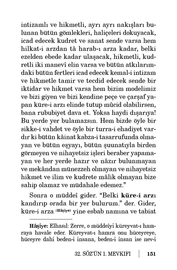intizamlı ve hikmetli, ayrı ayrı nakışları bulunan bütün gömlekleri, haliçeleri dokuyacak, icad edecek kudret ve sanat sende varsa hem hilkat-i arzdan tâ harab-ı arza kadar, belki ezelden ebede kadar ulaşacak, hikmetli, kudretli iki manevî elin varsa ve bütün atkılarımdaki bütün fertleri icad edecek kemal-i intizam ve hikmetle tamir ve tecdid edecek sende bir iktidar ve hikmet varsa hem bizim modelimiz ve bizi giyen ve bizi kendine peçe ve çarşaf yapan küre-i arzı elinde tutup mûcid olabilirsen, bana rububiyet dava et. Yoksa haydi dışarıya! Bu yerde yer bulamazsın. Hem bizde öyle bir sikke-i vahdet ve öyle bir turra-i ehadiyet vardır ki bütün kâinat kabza-i tasarrufunda olmayan ve bütün eşyayı, bütün şuunatıyla birden görmeyen ve nihayetsiz işleri beraber yapamayan ve her yerde hazır ve nâzır bulunmayan ve mekândan münezzeh olmayan ve nihayetsiz hikmet ve ilim ve kudrete mâlik olmayan bize sahip olamaz ve müdahale edemez.”