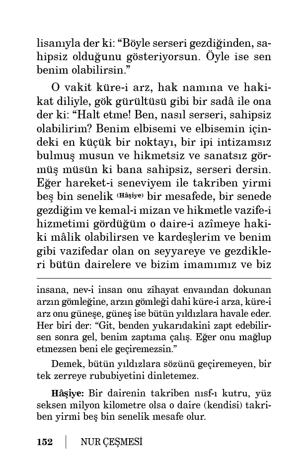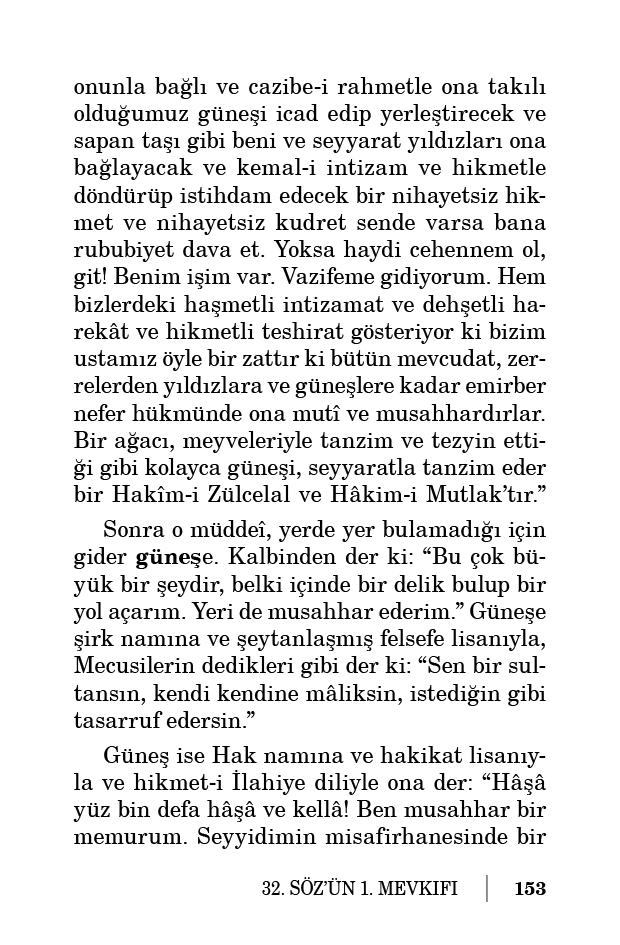 onunla bağlı ve cazibe-i rahmetle ona takılı olduğumuz güneşi icad edip yerleştirecek ve sapan taşı gibi beni ve seyyarat yıldızları ona bağlayacak ve kemal-i intizam ve hikmetle döndürüp istihdam edecek bir nihayetsiz hikmet ve nihayetsiz kudret sende varsa bana rububiyet dava et. Yoksa haydi cehennem ol, git! Benim işim var. Vazifeme gidiyorum. Hem bizlerdeki haşmetli intizamat ve dehşetli harekât ve hikmetli teshirat gösteriyor ki bizim ustamız öyle bir zattır ki bütün mevcudat, zerrelerden yıldızlara ve güneşlere kadar emirber nefer hükmünde ona mutî ve musahhardırlar. Bir ağacı, meyveleriyle tanzim ve tezyin ettiği gibi kolayca güneşi, seyyaratla tanzim eder bir Hakîm-i Zülcelal ve Hâkim-i Mutlak’tır.”
