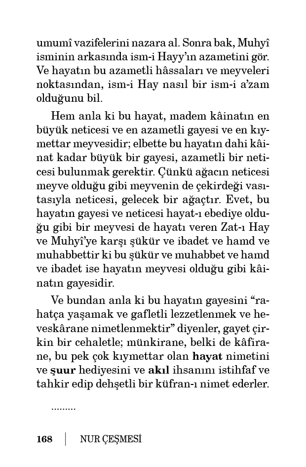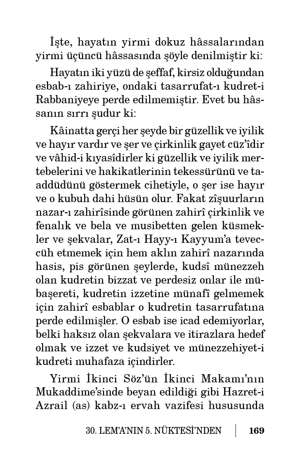 Kâinatta gerçi her şeyde bir güzellik ve iyilik ve hayır vardır ve şer ve çirkinlik gayet cüz’îdir ve vâhid-i kıyasîdirler ki güzellik ve iyilik mertebelerini ve hakikatlerinin tekessürünü ve taaddüdünü göstermek cihetiyle, o şer ise hayır ve o kubuh dahi hüsün olur. Fakat zîşuurların nazar-ı zahirîsinde görünen zahirî çirkinlik ve fenalık ve bela ve musibetten gelen küsmekler ve şekvalar, Zat-ı Hayy-ı Kayyum’a teveccüh etmemek için hem aklın zahirî nazarında hasis, pis görünen şeylerde, kudsî münezzeh olan kudretin bizzat ve perdesiz onlar ile mübaşereti, kudretin izzetine münafî gelmemek için zahirî esbablar o kudretin tasarrufatına perde edilmişler. O esbab ise icad edemiyorlar, belki haksız olan şekvalara ve itirazlara hedef olmak ve izzet ve kudsiyet ve münezzehiyet-i kudreti muhafaza içindirler.