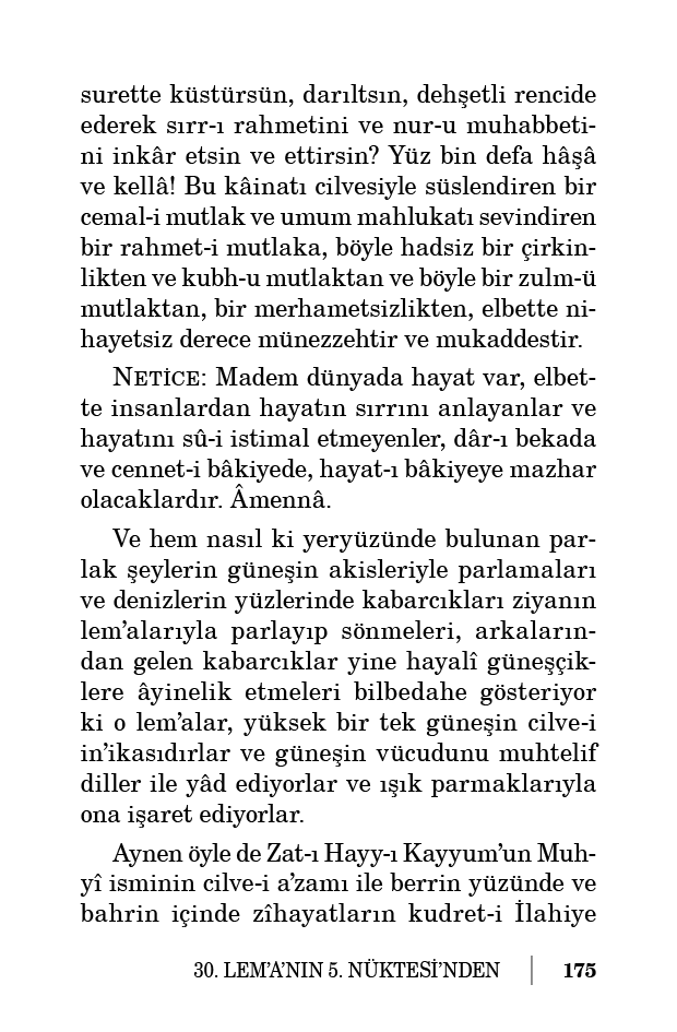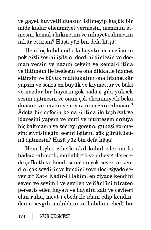 küstürsün, darıltsın, dehşetli rencide ederek sırr-ı rahmetini ve nur-u muhabbetini inkâr etsin ve ettirsin? Yüz bin defa hâşâ ve kellâ! Bu kâinatı cilvesiyle süslendiren bir cemal-i mutlak ve umum mahlukatı sevindiren bir rahmet-i mutlaka, böyle hadsiz bir çirkinlikten ve kubh-u mutlaktan ve böyle bir zulm-ü mutlaktan, bir merhametsizlikten, elbette nihayetsiz derece münezzehtir ve mukaddestir.