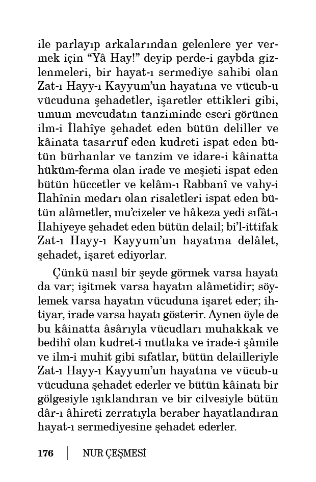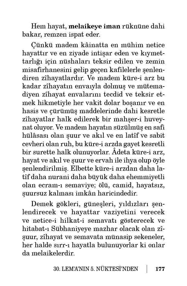 Çünkü madem kâinatta en mühim netice hayattır ve en ziyade intişar eden ve kıymettarlığı için nüshaları teksir edilen ve zemin misafirhanesini gelip geçen kafilelerle şenlendiren zîhayatlardır. Ve madem küre-i arz bu kadar zîhayatın envaıyla dolmuş ve mütemadiyen zîhayat envalarını tecdid ve teksir etmek hikmetiyle her vakit dolar boşanır ve en hasis ve çürümüş maddelerinde dahi kesretle zîhayatlar halk edilerek bir mahşer-i huveynat oluyor. Ve madem hayatın süzülmüş en safi hülâsası olan şuur ve akıl ve en latîf ve sabit cevheri olan ruh, bu küre-i arzda gayet kesretli bir surette halk olunuyorlar. Âdeta küre-i arz, hayat ve akıl ve şuur ve ervah ile ihya olup öyle şenlendirilmiş. Elbette küre-i arzdan daha latîf daha nurani daha büyük daha ehemmiyetli olan ecram-ı semaviye; ölü, camid, hayatsız, şuursuz kalması imkân haricindedir.