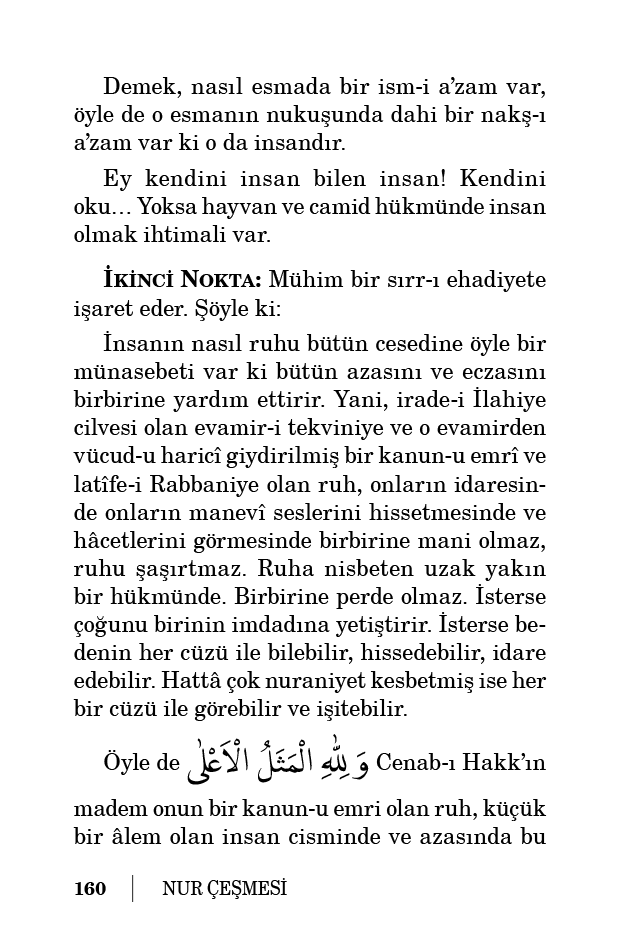 vaziyeti gösteriyor. Elbette âlem-i ekber olan kâinatta o Zat-ı Vâcibü’l-vücud’un irade-i külliyesine ve kudret-i mutlakasına hadsiz fiiller, hadsiz sadâlar, hadsiz dualar, hadsiz işler, hiçbir cihette ona ağır gelmez, birbirine mani olmaz. O Hâlık-ı Zülcelal’i meşgul etmez, şaşırtmaz. Bütününü birden görür, bütün sesleri birden işitir. Yakın uzak birdir. İsterse bütününü birinin imdadına gönderir. Her şey ile her şeyi görebilir, seslerini işitebilir ve her şey ile her şeyi bilir ve hâkeza…