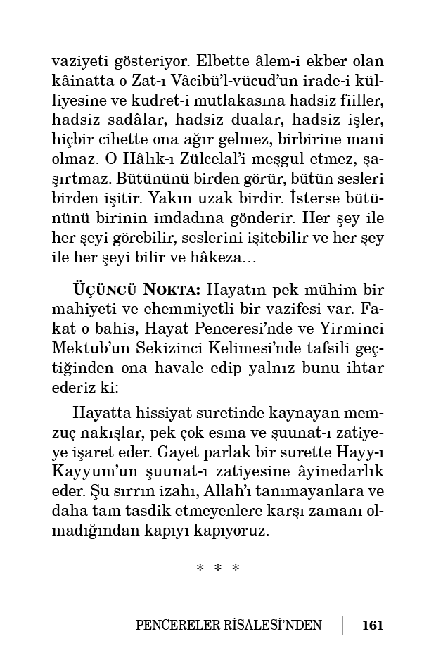 Üçüncü Nokta: Hayatın pek mühim bir mahiyeti ve ehemmiyetli bir vazifesi var. Fakat o bahis, Hayat Penceresi’nde ve Yirminci Mektub’un Sekizinci Kelimesi’nde tafsili geçtiğinden ona havale edip yalnız bunu ihtar ederiz ki: