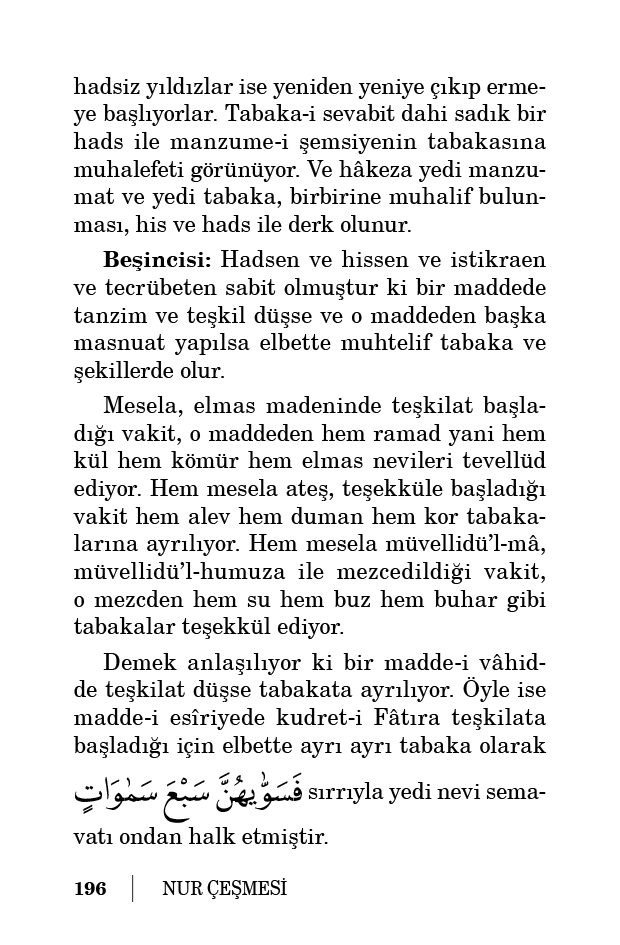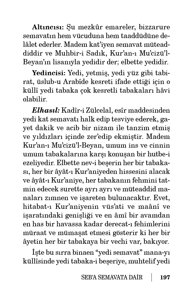 Elhasıl: Kadîr-i Zülcelal, esîr maddesinden yedi kat semavatı halk edip tesviye ederek, gayet dakik ve acib bir nizam ile tanzim etmiş ve yıldızları içinde zer’edip ekmiştir. Madem Kur’an-ı Mu’cizü’l-Beyan, umum ins ve cinnin umum tabakalarına karşı konuşan bir hutbe-i ezeliyedir. Elbette nev-i beşerin her bir tabakası, her bir âyât-ı Kur’aniyeden hissesini alacak ve âyât-ı Kur’aniye, her tabakanın fehmini tatmin edecek surette ayrı ayrı ve müteaddid manaları zımnen ve işareten bulunacaktır. Evet, hitabat-ı Kur’aniyenin vüs’ati ve maânî ve işaratındaki genişliği ve en âmî bir avamdan en has bir havassa kadar derecat-ı fehimlerini müraat ve mümaşat etmesi gösterir ki her bir âyetin her bir tabakaya bir vechi var, bakıyor.