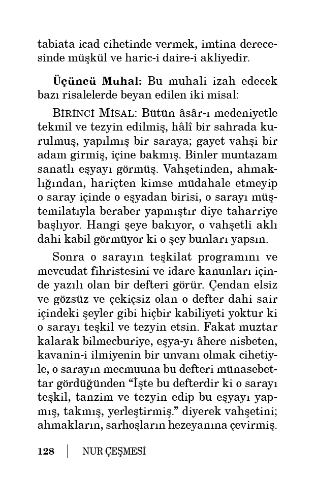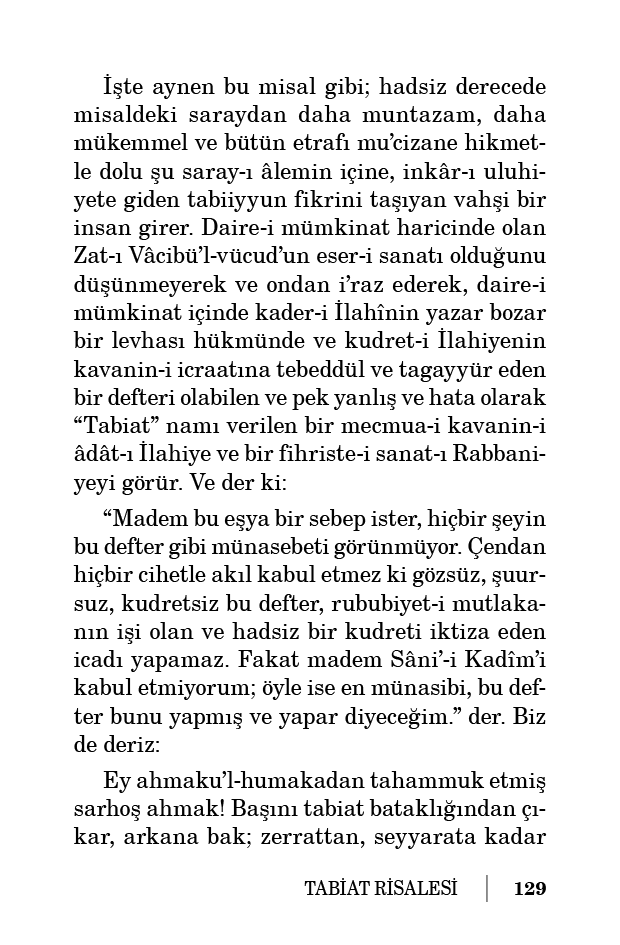 İşte aynen bu misal gibi; hadsiz derecede misaldeki saraydan daha muntazam, daha mükemmel ve bütün etrafı mu’cizane hikmetle dolu şu saray-ı âlemin içine, inkâr-ı uluhiyete giden tabiiyyun fikrini taşıyan vahşi bir insan girer. Daire-i mümkinat haricinde olan Zat-ı Vâcibü’l-vücud’un eser-i sanatı olduğunu düşünmeyerek ve ondan i’raz ederek, daire-i mümkinat içinde kader-i İlahînin yazar bozar bir levhası hükmünde ve kudret-i İlahiyenin kavanin-i icraatına tebeddül ve tagayyür eden bir defteri olabilen ve pek yanlış ve hata olarak “Tabiat” namı verilen bir mecmua-i kavanin-i âdât-ı İlahiye ve bir fihriste-i sanat-ı Rabbaniyeyi görür. Ve der ki: