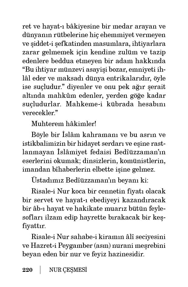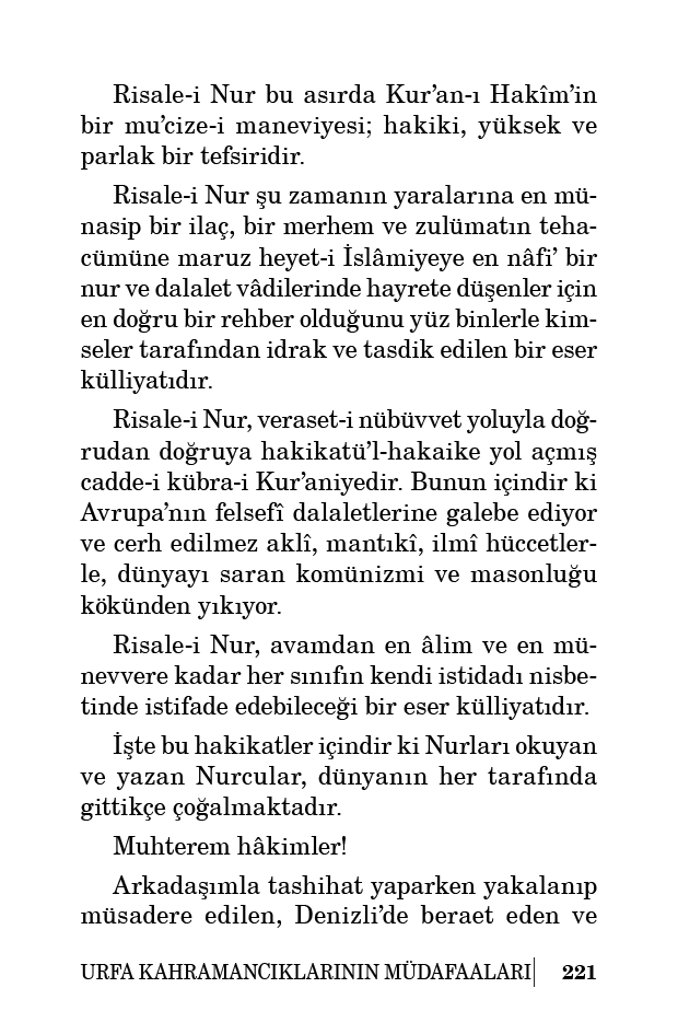 Risale-i Nur şu zamanın yaralarına en münasip bir ilaç, bir merhem ve zulümatın tehacümüne maruz heyet-i İslâmiyeye en nâfi’ bir nur ve dalalet vâdilerinde hayrete düşenler için en doğru bir rehber olduğunu yüz binlerle kimseler tarafından idrak ve tasdik edilen bir eser külliyatıdır.