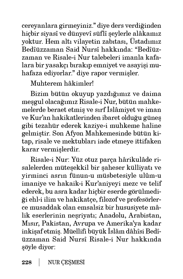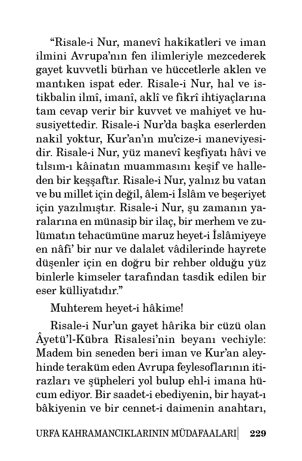 “Risale-i Nur, manevî hakikatleri ve iman ilmini Avrupa’nın fen ilimleriyle mezcederek gayet kuvvetli bürhan ve hüccetlerle aklen ve mantıken ispat eder. Risale-i Nur, hal ve istikbalin ilmî, imanî, aklî ve fikrî ihtiyaçlarına tam cevap verir bir kuvvet ve mahiyet ve hususiyettedir. Risale-i Nur’da başka eserlerden nakil yoktur, Kur’an’ın mu’cize-i maneviyesidir. Risale-i Nur, yüz manevî keşfiyatı hâvi ve tılsım-ı kâinatın muammasını keşif ve halleden bir keşşaftır. Risale-i Nur, yalnız bu vatan ve bu millet için değil, âlem-i İslâm ve beşeriyet için yazılmıştır. Risale-i Nur, şu zamanın yaralarına en münasip bir ilaç, bir merhem ve zulümatın tehacümüne maruz heyet-i İslâmiyeye en nâfi’ bir nur ve dalalet vâdilerinde hayrete düşenler için en doğru bir rehber olduğu yüz binlerle kimseler tarafından tasdik edilen bir eser külliyatıdır.”