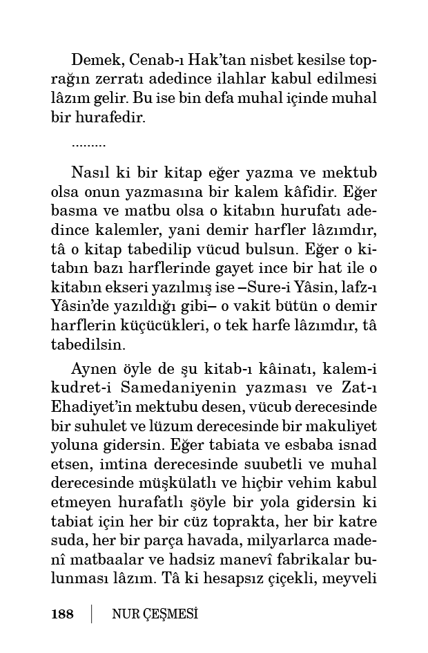 Çünkü toprağın ve suyun ve havanın her bir cüzü, ekser nebatata menşe olabilir. Halbuki her bir nebat –meyveli olsa, çiçekli olsa– teşekkülatı o kadar muntazamdır, o kadar mevzundur, o kadar birbirinden mümtazdır, o kadar keyfiyetçe birbirinden ayrıdır ki her birisine, yalnız ona mahsus birer ayrı manevî fabrika veya ayrı birer matbaa lâzımdır.