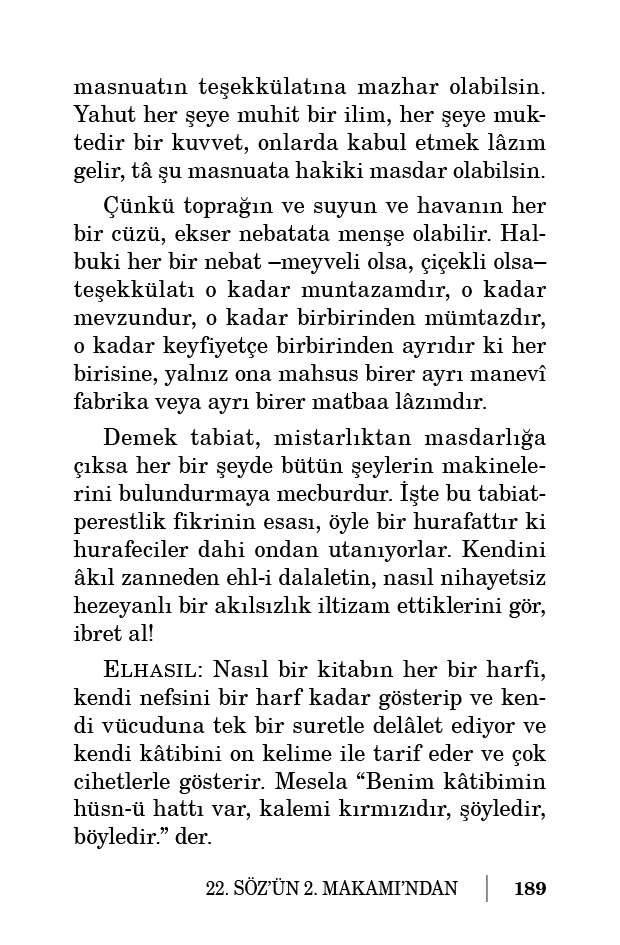 Demek tabiat, mistarlıktan masdarlığa çıksa her bir şeyde bütün şeylerin makinelerini bulundurmaya mecburdur. İşte bu tabiat-perestlik fikrinin esası, öyle bir hurafattır ki hurafeciler dahi ondan utanıyorlar. Kendini âkıl zanneden ehl-i dalaletin, nasıl nihayetsiz hezeyanlı bir akılsızlık iltizam ettiklerini gör, ibret al!