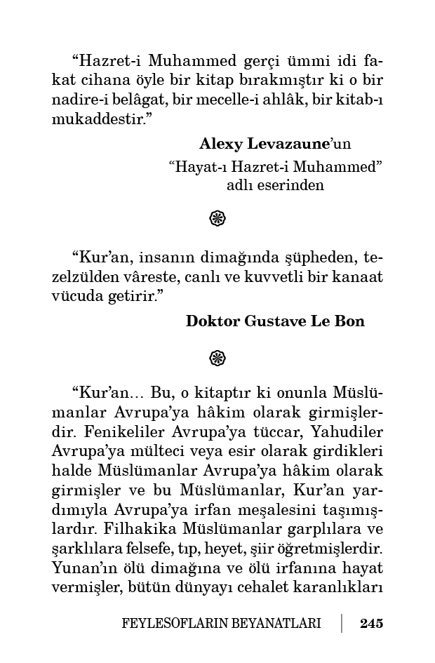 “Kur’an; bütün kuva-yı beşeriyenin, tılsımını çözmekten âciz kaldığı muazzam bir sırdır. İslâmiyet; canları, malları koruyan, hâkimiyeti altında yaşayan dinlere şâyan-ı hayret müsamaha gösteren bir dindir.”