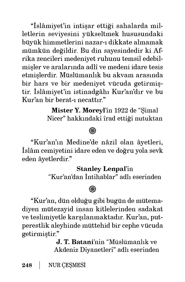 “İslâmiyet’in intişar ettiği sahalarda milletlerin seviyesini yükseltmek hususundaki büyük himmetlerini nazar-ı dikkate almamak mümkün değildir. Bu din sayesindedir ki Afrika zencileri medeniyet ruhunu temsil edebilmişler ve aralarında adlî ve medeni idare tesis etmişlerdir. Müslümanlık bu akvam arasında bir hars ve bir medeniyet vücuda getirmiştir. İslâmiyet’in istinadgâhı Kur’an’dır ve bu Kur’an bir berat-ı necattır.”