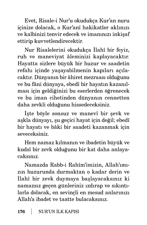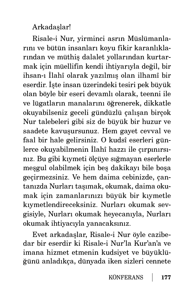 Risale-i Nur, yirminci asrın Müslümanlarını ve bütün insanları koyu fikir karanlıklarından ve müthiş dalalet yollarından kurtarmak için müellifin kendi ihtiyarıyla değil, bir ihsan-ı İlahî olarak yazılmış olan ilhamî bir eserdir. İşte insan üzerindeki tesiri pek büyük olan böyle bir eseri devamlı olarak, teenni ile ve lügatların manalarını öğrenerek, dikkatle okuyabilseniz geceli gündüzlü çalışan birçok Nur talebeleri gibi siz de büyük bir huzur ve saadete kavuşursunuz. Hem gayet cevval ve faal bir hale gelirsiniz. O kudsî eserleri günlerce okuyabilmenin İlahî hazzı ile çırpınırsınız. Bu gibi kıymeti ölçüye sığmayan eserlerle meşgul olabilmek için beş dakikayı bile boşa geçirmezsiniz. Ve hem daima cebinizde, çantanızda Nurları taşımak, okumak, daima okumak için zamanlarınızı büyük bir kıymetle kıymetlendireceksiniz. Nurları okumak sevgisiyle, Nurları okumak heyecanıyla, Nurları okumak ihtiyacıyla yanacaksınız.