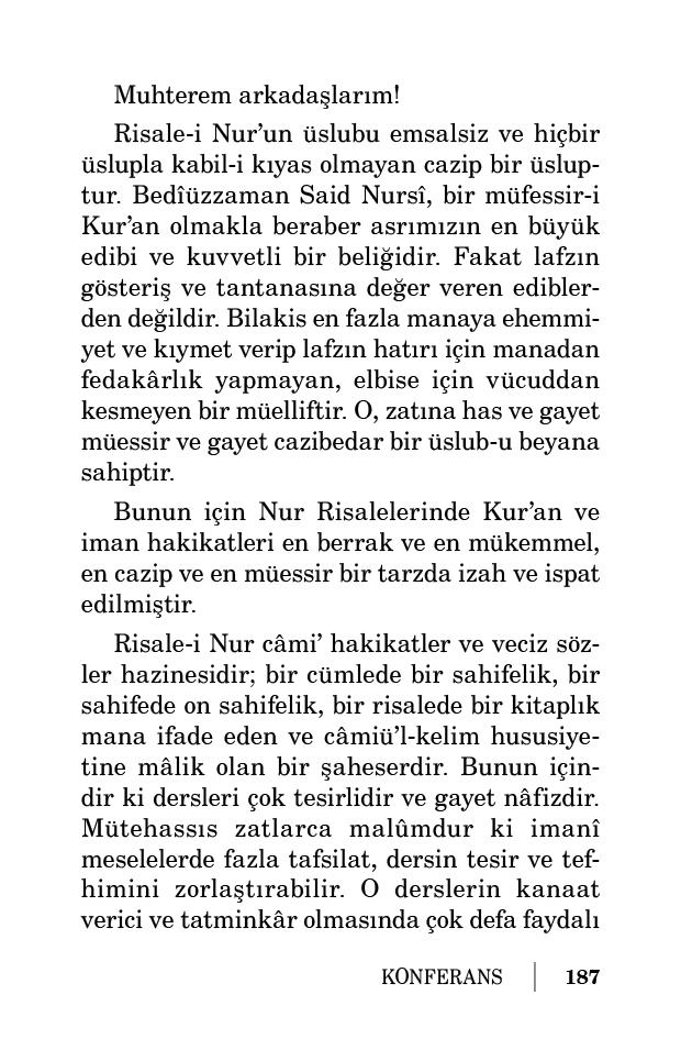 Risale-i Nur câmi’ hakikatler ve veciz sözler hazinesidir; bir cümlede bir sahifelik, bir sahifede on sahifelik, bir risalede bir kitaplık mana ifade eden ve câmiü’l-kelim hususiyetine mâlik olan bir şaheserdir. Bunun içindir ki dersleri çok tesirlidir ve gayet nâfizdir. Mütehassıs zatlarca malûmdur ki imanî meselelerde fazla tafsilat, dersin tesir ve tefhimini zorlaştırabilir. O derslerin kanaat verici ve tatminkâr olmasında çok defa faydalı