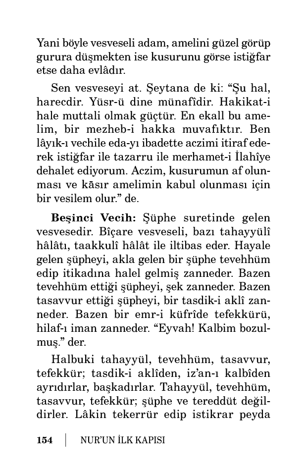 Beşinci Vecih: Şüphe suretinde gelen vesvesedir. Bîçare vesveseli, bazı tahayyülî hâlâtı, taakkulî hâlât ile iltibas eder. Hayale gelen şüpheyi, akla gelen bir şüphe tevehhüm edip itikadına halel gelmiş zanneder. Bazen tevehhüm ettiği şüpheyi, şek zanneder. Bazen tasavvur ettiği şüpheyi, bir tasdik-i aklî zanneder. Bazen bir emr-i küfrîde tefekkürü, hilaf-ı iman zanneder. “Eyvah! Kalbim bozulmuş.” der.