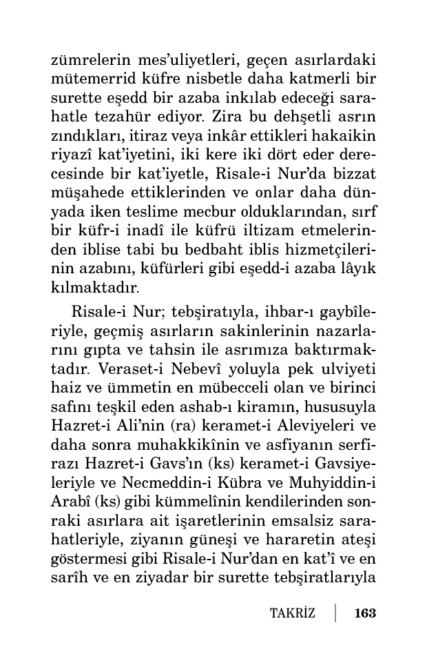 Risale-i Nur; tebşiratıyla, ihbar-ı gaybîleriyle, geçmiş asırların sakinlerinin nazarlarını gıpta ve tahsin ile asrımıza baktırmaktadır. Veraset-i Nebevî yoluyla pek ulviyeti haiz ve ümmetin en mübecceli olan ve birinci safını teşkil eden ashab-ı kiramın, hususuyla Hazret-i Ali’nin (ra) keramet-i Aleviyeleri ve daha sonra muhakkikînin ve asfiyanın serfirazı Hazret-i Gavs’ın (ks) keramet-i Gavsiyeleriyle ve Necmeddin-i Kübra ve Muhyiddin-i Arabî (ks) gibi kümmelînin kendilerinden sonraki asırlara ait işaretlerinin emsalsiz sarahatleriyle, ziyanın güneşi ve hararetin ateşi göstermesi gibi Risale-i Nur’dan en kat’î ve en sarîh ve en ziyadar bir surette tebşiratlarıyla