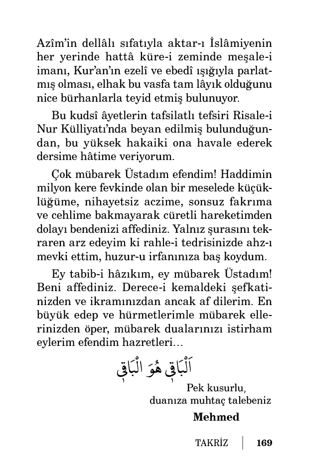 Çok mübarek Üstadım efendim! Haddimin milyon kere fevkinde olan bir meselede küçüklüğüme, nihayetsiz aczime, sonsuz fakrıma ve cehlime bakmayarak cüretli hareketimden dolayı bendenizi affediniz. Yalnız şurasını tekraren arz edeyim ki rahle-i tedrisinizde ahz-ı mevki ettim, huzur-u irfanınıza baş koydum.